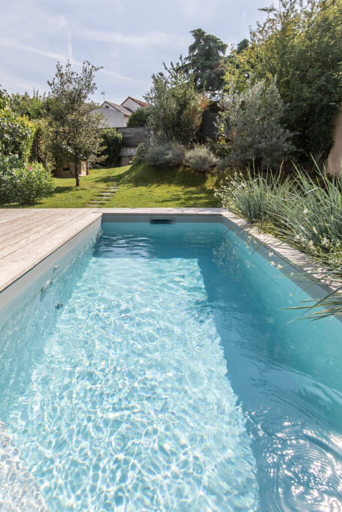 Équipements : PAC, escabanc d’angle, projecteur LED blanc, injection automatique de Redox, coffret anti-gel