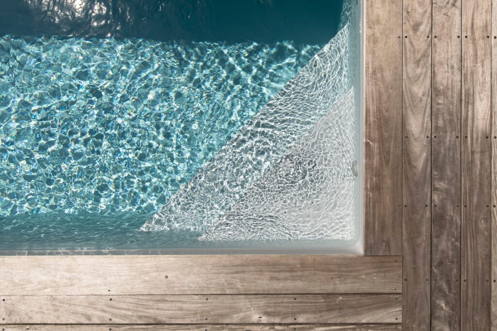 Autour du bassin, le bois domine. De l’ipé pour les margelles et la plage, et c’est toute la terrasse qui se pare du même matériau dans l’esprit de la maison couverte d’un bardage en bois. La piscine semble ainsi attachée à la demeure, lui offrant son accès au plus près de ses ouvertures vitrées. Deux marches immergées dans un angle du bassin invitent à descendre dans l’eau ou à se poser là, assis, pour un moment de détente et de convivialité entre amis ou en famille. La magie opère grâce au bleu de l’eau dont les reflets scintillent et illuminent les pièces de vie. Une couleur vive voulue et obtenue par le choix d’un liner de couleur gris clair qui estompe la dominante bleue de l’eau pour faire ressortir ses reflets argentés. À la nuit tombée, le bassin prend vie sous les feux de son projecteur immergé, offrant de poursuivre son attrait de nuit comme de jour, et ce, jusqu’à la fin de l’été.