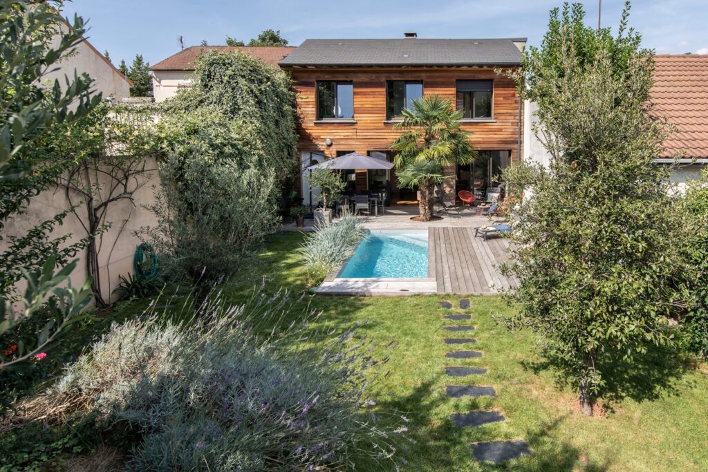 Un aménagement paysager autour d’une piscine est une articulation harmonieuse entre un jardin, une maison et son bassin. C’est une partition sur laquelle toutes les notes doivent s’accorder. Pour cette réalisation de piscine et jardin, il a été tenu compte de l’espace réduit du terrain pour intégrer un bassin proportionné et insérer la végétation autour. L’un et l’autre se répondent, se complètent, s’équilibrent pour offrir un espace de vie agréable. Les végétaux se forment en touffes au bord du bassin, tandis que plus loin leurs tailles s’amplifient ou montent à la verticale sur les murs mitoyens de la propriété. Le relief est marqué, portant un bosquet plus haut sur le terrain. La palette des tons verts s’exprime ici sous toutes ses latitudes.