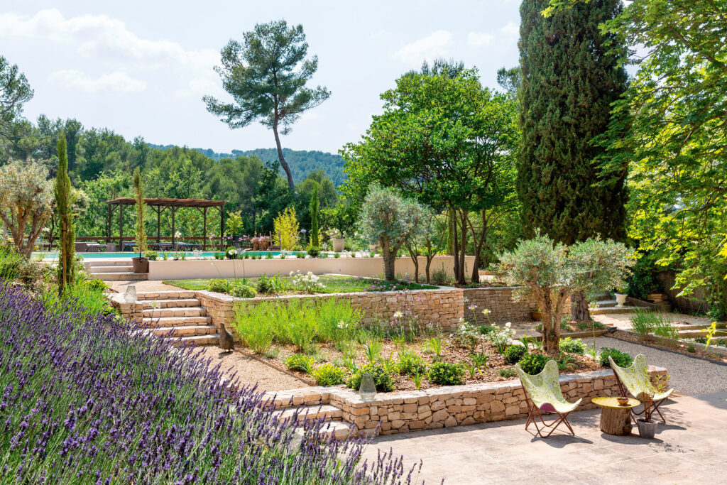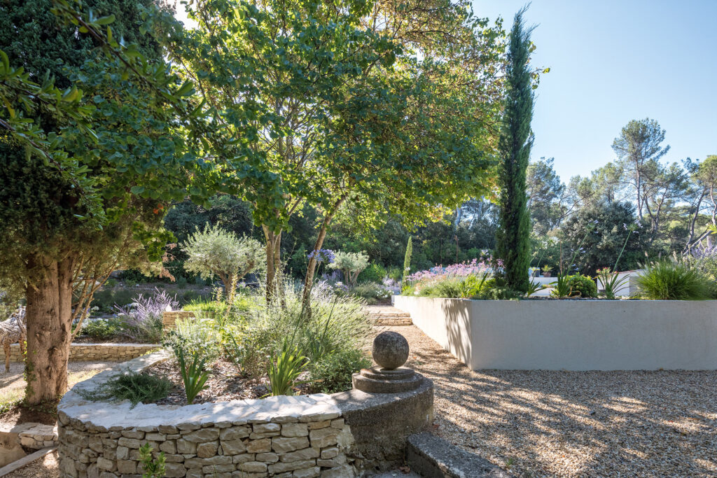 Longtemps délaissé, le jardin avait été envahi par une nature un brin échevelée qu’il fallait dompter pour redonner au lieu tout son charme passé. Un important travail de défrichage et de nettoyage a précédé la construction de murs en pierre (provenant des Alpes de Haute-Provence), la création de nouvelles circulations et la plantation d’oliviers, de lavandes, de romarins, d’agapanthes, de rosiers blancs, de pittosporum et d’autres végétaux adaptés au climat du sud de la France et peu gourmands en eau. Quelques végétaux d’ombre ponctuent les espaces sous les marronniers, tels que des bambous, des hortensias, des liriopes… Le gazon, rustique, est appelé, avec le temps, à offrir un aspect de prairie. Après trois mois de travaux, cette propriété a retrouvé son lustre d’antan et le parking lui-même s’intègre dans ce petit coin de Provence au charme intemporel.