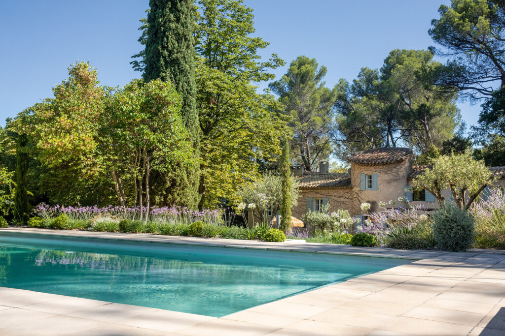 Réveiller la « belle endormie », restructurer les espaces, créer du lien entre la bâtisse et son environnement immédiat, autant d’actions requises pour offrir aux différentes ambiances une véritable cohérence. La bastide possédait déjà du caractère, il suffisait donc de dessiner l’écrin appelé à la mettre davantage encore en valeur. Pour Yoran Morvant et Nicolas Moingeon, de l’agence éponyme, la principale difficulté a été de réussir la connexion entre la maison et la piscine toute proche. Cette dernière se trouvant plus élevée que le bâti, il a fallu organiser le chemin y conduisant. Cette zone de transition prend la forme de restanques, avec des surfaces engazonnées et d’autres complantées d’oliviers et de plantes méditerranéennes, reliées entre elles par des escaliers en pierre et des paliers en gravier. Une opération qui permet aujourd’hui au regard d’embrasser l’ensemble que l’on se trouve à l’intérieur ou sur la terrasse devant la maison ou encore au bord du bassin. En bout de piscine, le solarium a été rénové et accueille désormais famille et amis pour des séances de farniente.