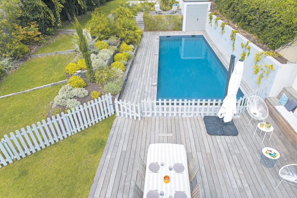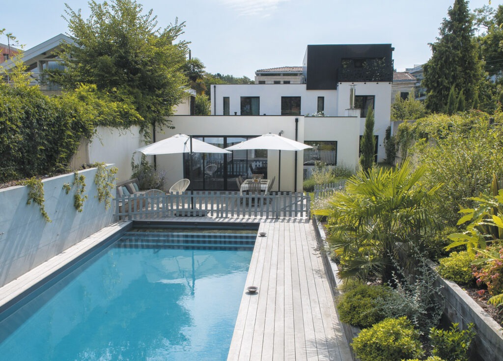 Alors que cette dernière se dotait d’une extension, la transformation de la propriété a été totale avec l’intégration de la piscine dans un terrain à la forte élévation. Un impressionnant travail de décaissement a été réalisé pour pouvoir positionner l’espace piscine au même niveau que la maison. Initialement contactée par les propriétaires pour métamorphoser de la sorte leur jardin, l’architecte s’est rapidement appuyé sur l’expertise de deux professionnels : un piscinier et un paysagiste. S’il a été difficile pour les clients de visualiser la façon dont leur futur bassin allait prendre place sur l’imposante butte de terre, le résultat en revanche correspond parfaitement à ce qui avait été imaginé lors de la phase de projet. Pour tirer au maximum profit de l’espace rendu disponible par les opérations de décaissement, le local technique est encastré dans la butte et jouxte une terrasse solarium surélevée.