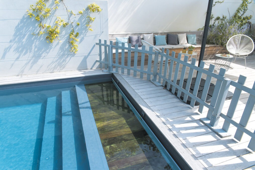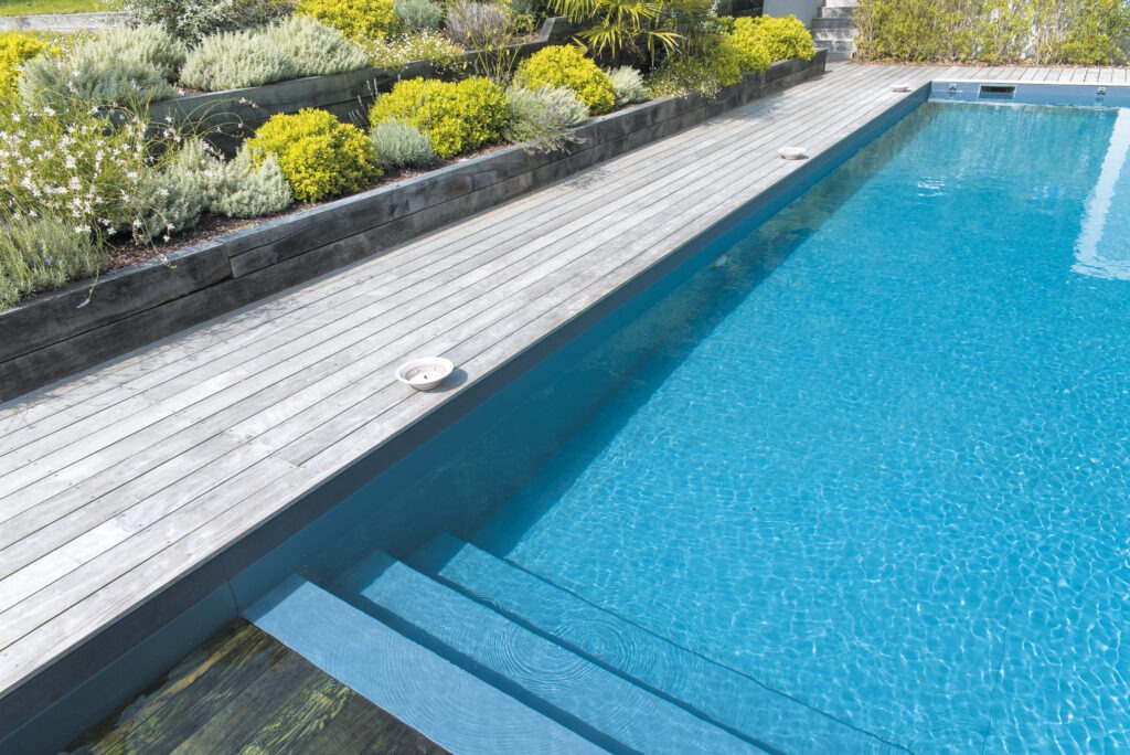 La première marche de l’escalier est en partie recouverte de caillebotis en bois, réalisés avec les mêmes lames que la plage. Immergés, ils font le lien avec la terrasse et soulignent la première marche de la piscine, qui abrite le volet immergé et fait office