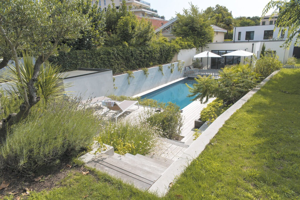 Dans un environnement densément bâti mais qui a su réserver une place importante à la verdure, les propriétaires ont souhaité donner un nouveau visage à leurs extérieurs en faisant la part belle à la nature. Dès les prémices du projet, leur volonté a été clairement énoncée : plus qu’une piscine, c’est un bassin naturel qui était recherché afin de s’intégrer au mieux dans un environnement verdoyant qui contrasterait avec l’aspect moderne très architecturé de la maison.