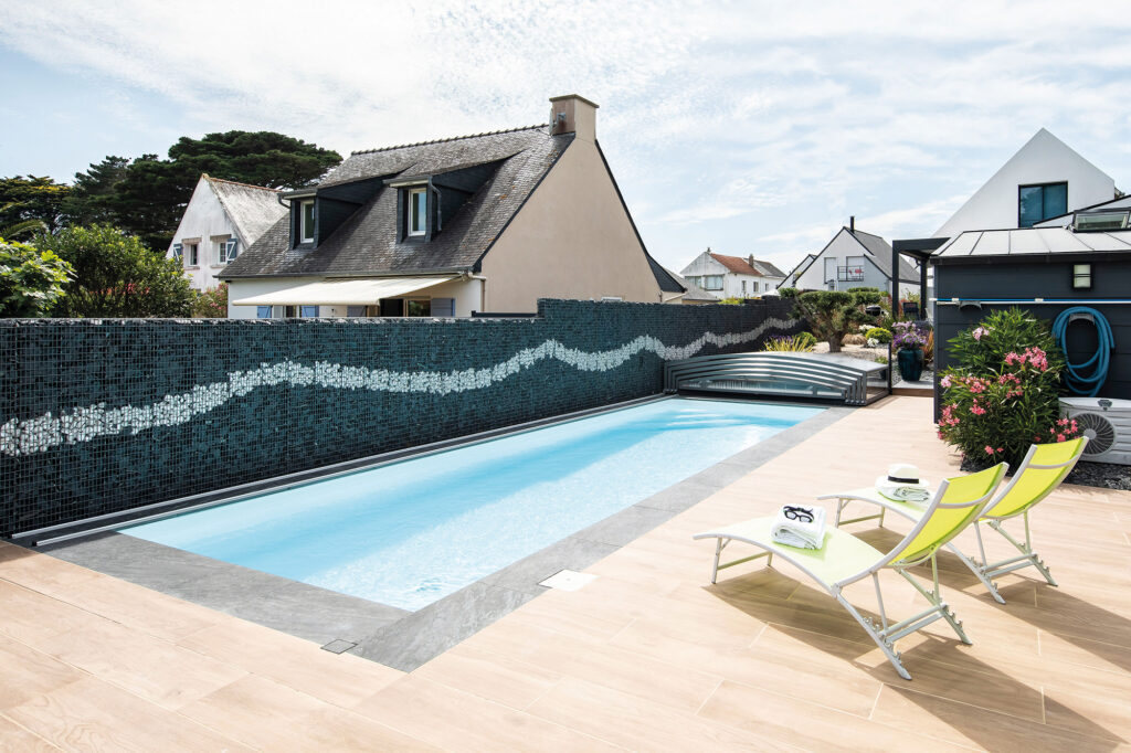 Conserver l’esthétique du lieu est un souci majeur lors de l’installation d’un abri de piscine. Dans cette région de Bretagne, bordée par l’océan, sur la presqu’île de Quiberon, la piscine s’impose à la vue entre la maison et la mer. L’abri devait alors s’intégrer dans le paysage, sans empiéter sur le panorama. La mise en place d’un abri « Stretto », discret, a été choisie pour ses modules bas entièrement rétractables en bout de bassin, constitués de panneaux de polycarbonate alvéolaire à courbes tendues, et de parois latérales transparentes. Particulièrement bas et légèrement galbé, l’abri s’insère avec discrétion dans la mise en scène du jardin.