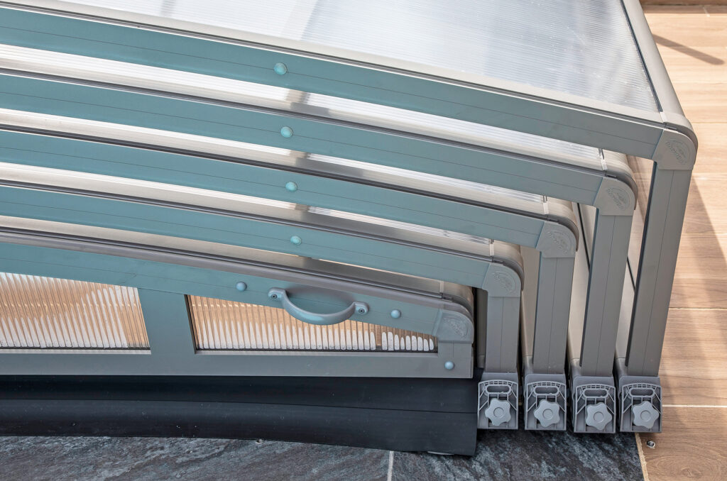 La fermeture de l’abri est sécurisée par un système de molette à clé discret. Les molettes de fixation se vissent au sol manuellement une fois les modules déployés au-dessus de la piscine. Ce type de verrouillage optimise la fermeture de l’abri en cas d’intempéries, mais également assure une parfaite sécurité en empêchant l’accès au bassin.
