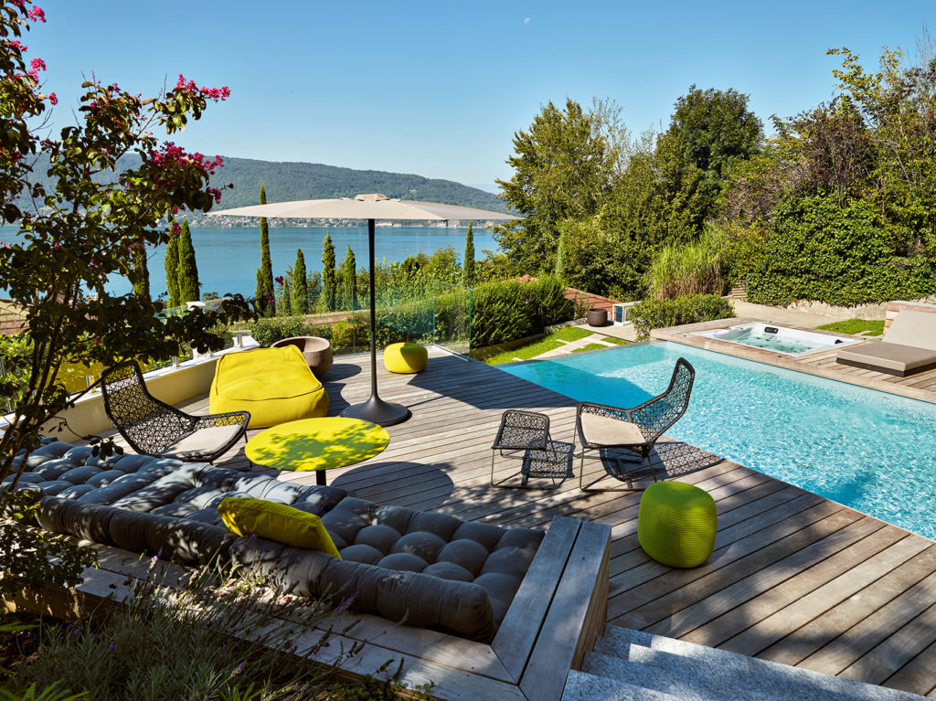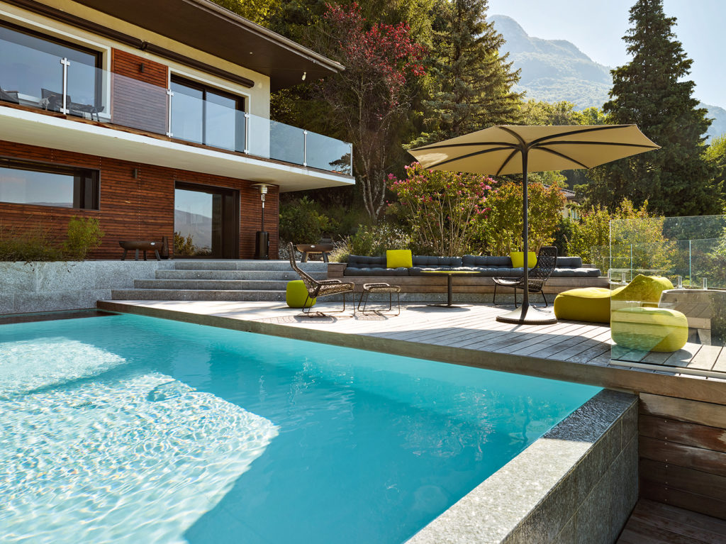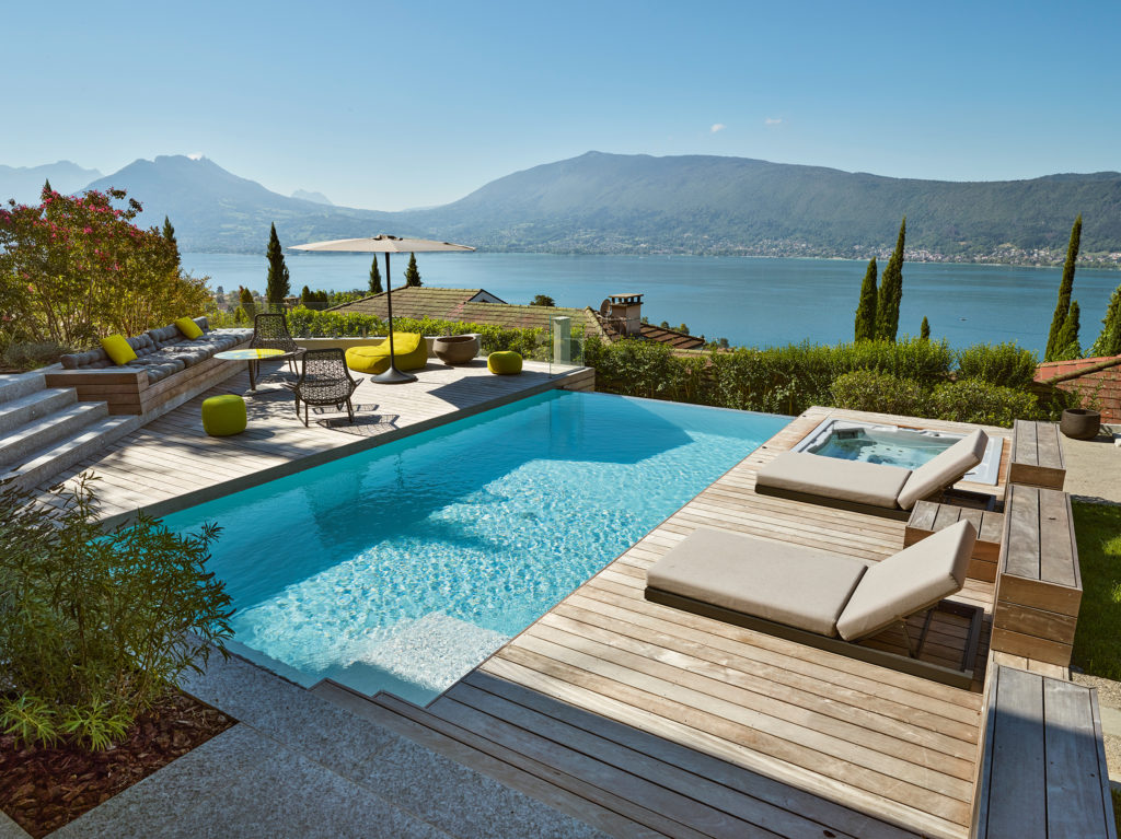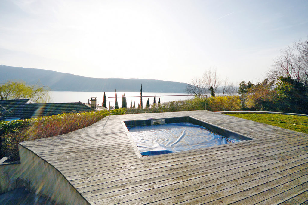 Une piscine de huit mètres par quatre a été imaginée sous la plume d’un architecte, et allongée jusqu’en bout de terrain. Le dénivelé, la vue, offraient toutes les conditions à la réalisation d’un débordement sur une largeur. La vision file ainsi de la surface de l’eau du bassin vers le lac avec la recherche d’un colorama similaire. La piscine est revêtue d’une membrane armée gris clair afin d’accorder la teinte de son eau à celle du lac. L’aspect esthétique est également doublé du respect des prérogatives aux règles d’urbanisme de la commune sur la couleur des eaux de piscine, qui ne doit être ni bleu azur ni turquoise. Le mur de débordement en bout de bassin a bénéficié d’une attention particulière puisqu’il est visible dès l’entrée dans la propriété, laquelle se fait en bas du terrain, à un niveau inférieur à la piscine.