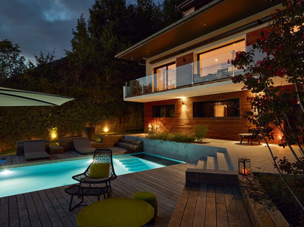 Il est habillé en pierre naturelle de Luzerne des Alpes, un quartzite gris. Cette même pierre recouvre les marches des escaliers menant à l’espace piscine depuis les pièces de vie de la maison. Quant au bac tampon en contrebas, lui aussi visible depuis l’entrée de la propriété, il est recouvert de bois d’ipé, identique à celui immergé à l’autre bout de la piscine, qui fait office de plage sous laquelle est dissimulé le volet roulant venant couvrir le bassin. Le choix de ces matériaux, bois et pierre grise, qui s’enchaînent tour à tour en plusieurs lieux, jusque sur les façades de l’habitation, donne un aspect moderne et marque les différents niveaux du terrain.