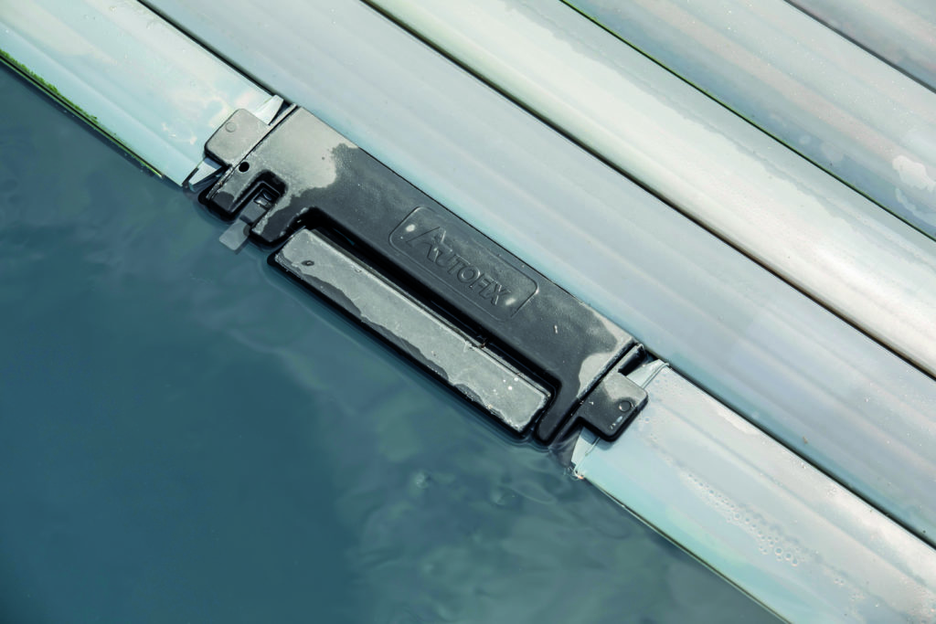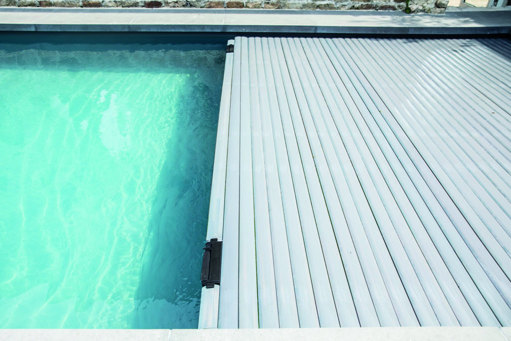 Un volet immergé à verrouillage automatique sans manipulation a été choisi pour un maximum de confort d’usage. Grâce à son système magnétique sur la première lame du tablier de la couverture, il vient se fixer à ses récepteurs invisibles placés derrière le liner, pour verrouiller le bassin en toute autonomie.