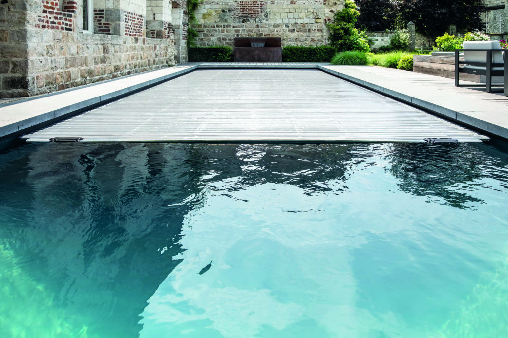 Installée dans un jardin à la française, au milieu des vieilles pierres d’une ancienne abbaye, la piscine s’est offert un lifting, des marches et un volet immergés, en toute discrétion.