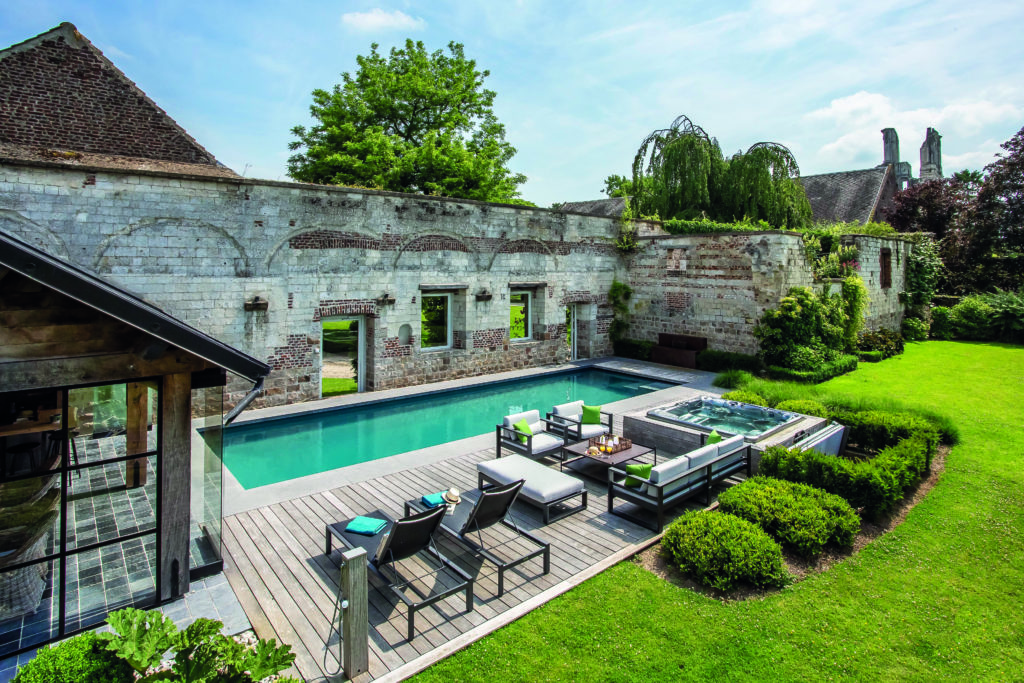 Située dans l’un des plus beaux villages du Nord Pas-de-Calais, à Mont-Saint-Eloi, la piscine est installée derrière l’un des pignons de l’ancienne ferme attenante à l’abbaye. Elle est bordée par un mur en vieilles pierres, vestige des bâtiments appartenant au monastère du Xe siècle qui fait la renommée du village et le cachet historique de cette demeure. La piscine est une rénovation d’un ancien bassin plus petit et moins fonctionnel. Caché sous un abri adossé au mur de pierres, massif et difficile à ouvrir, le bassin n’était plus utilisé. Une rénovation complète s’est orchestrée.