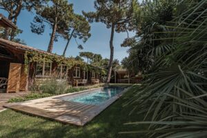 Semi encastré, habillé d’ipé, la même essence que celle choisie pour la terrasse, il est facilement accessible côté piscine, tandis que le décaissement à l’arrière permet de cacher sa couverture. La piscine, le spa, et le pool house, qui accueille aussi une salle à manger et une cuisine d’été, sont situés au coeur d’un jardin travaillé en carré, à la française. Ces îlots de végétation sont des références aux jardins monastiques du Moyen Âge dans lesquels les moines cultivaient des herbes médicinales, d’autres pour la cuisine, ou des fleurs pour décorer les églises. Le détail est ici au service de l’esthétique et d’une intégration à l’histoire du lieu.