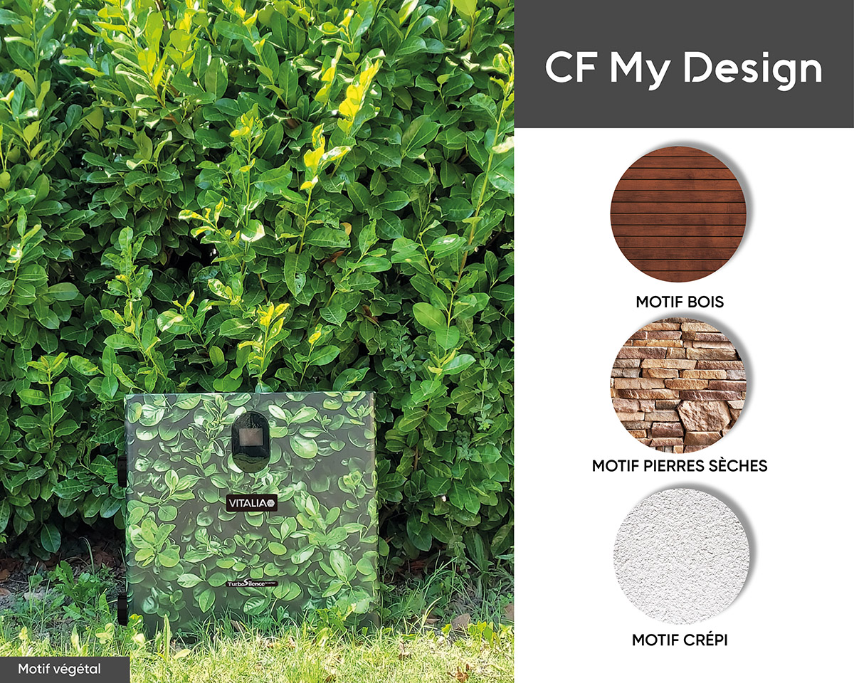 Avec CF My Design, le nouveau service de personnalisation de CF Group France, votre pompe à chaleur se fond dans le décor de votre jardin. En effet, en plus d’être extrêmement silencieuse, la PAC Vitalia Premium, peut être habillée d’un adhésif avec 4 motifs au choix pour s’adapter à la plupart des extérieurs : bois, pierres sèches, végétal et crépi. Posé en usine, résistant aux intempéries et à la lumière, l’adhésif est imprimé avec de l’encre à base d’eau, sans solvant.