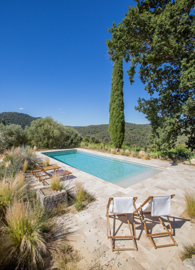 Enfin, la piscine bénéficie d’un jardin astucieusement aménagé par le paysagiste qui a préconisé des massifs capables de résister aux grandes chaleurs et à un fort ensoleillement, et dont la pousse reste basse. Ceux-ci ne risquent donc pas de masquer l’étendue du paysage en se développant.