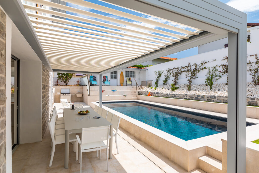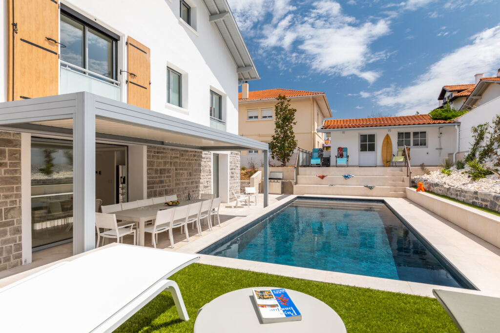 Le réaménagement total de l’espace a permis de créer une terrasse plus intimiste en bois pour accueillir un spa, mais aussi une cuisine d’été et une zone séjour salle à manger estivale au bord du bassin, dans le prolongement immédiat de la maison. Une pergola bioclimatique abrite ce nouveau lieu de vie pour un grand confort d’utilisation au cours des saisons.