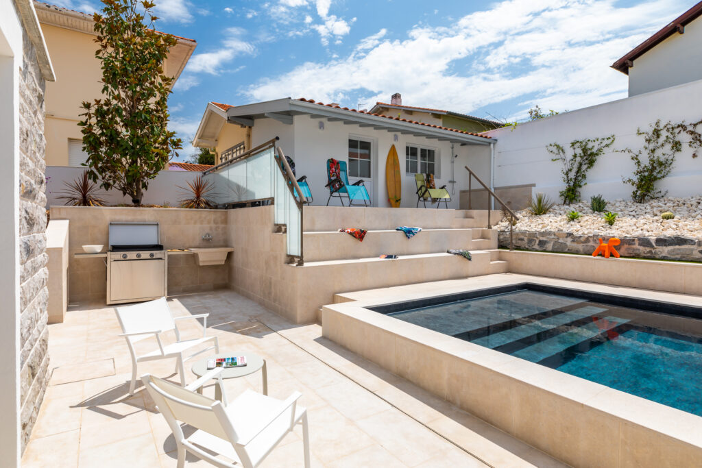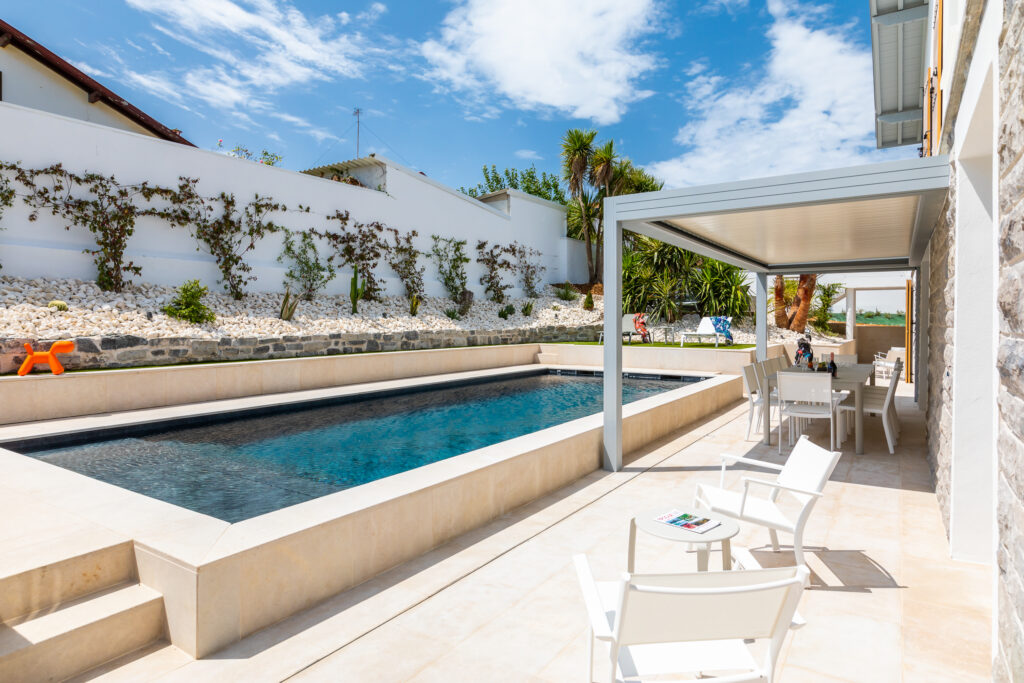 Côté contraintes, il y en a eu. Afin d’adapter l’ouvrage au type de sol argileux inhérent à la région, un drain a été installé sur les pourtours de la dalle en béton de fond. L’eau du terrain est ainsi évacuée dans un puits de décompression. Une fois les parois construites en blocs béton à bancher, l’ouvrage a été recouvert d’une membrane armée, très épaisse et résistante, offrant une garantie supplémentaire d’étanchéité. Le choix s’est tourné vers une membrane en 3D Touch imprimé ardoise, dont l’effet naturel donne du relief et de la personnalité à cette piscine basque. L’eau apparaît d’un bleu profond tandis que la matière texturée est étonnante au toucher. Cet aspect ne manque pas d’ajouter une touche esthétique à cette piscine. Le seul élément qui n’a pas bougé dans la refonte de l’espace extérieur est le pool house qui abrite le local technique et se trouve désormais en surplomb de la piscine.