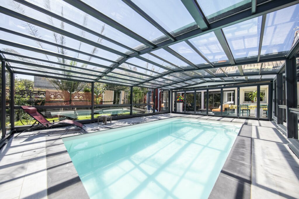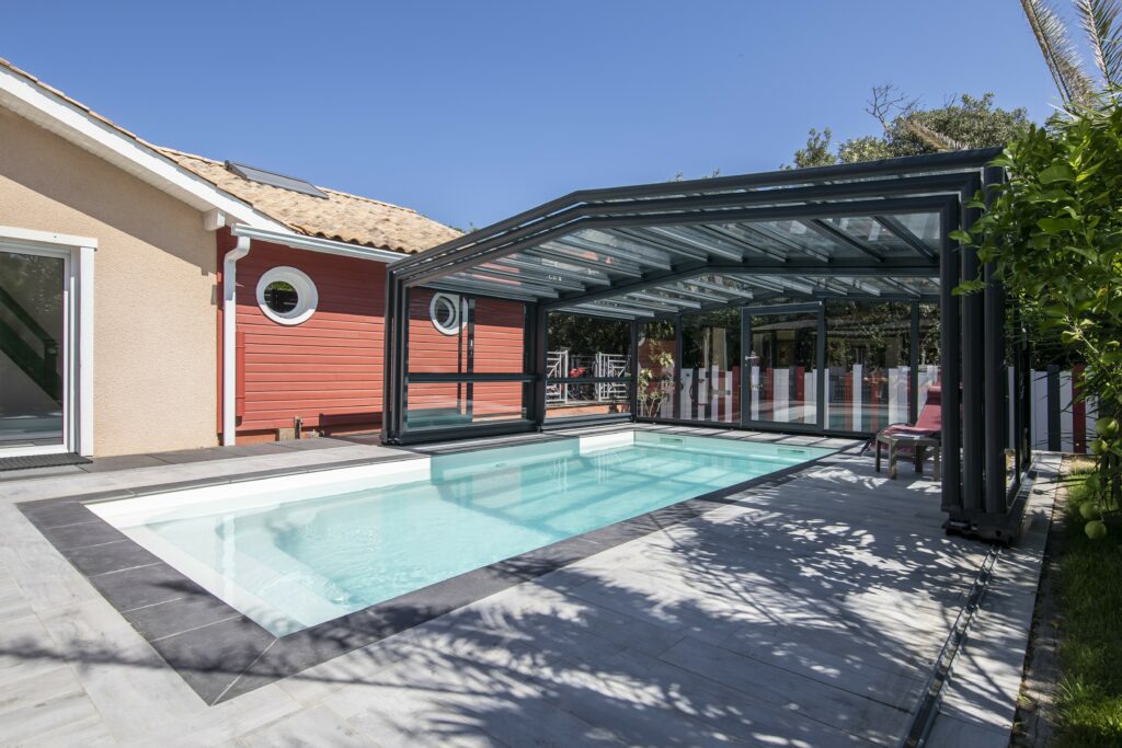 La réalisation combinée d’un abri au-dessus d’une piscine et d’un abri en toiture permet la création d’un nouvel espace de vie accolé à la maison. Le gain de pièce est immédiat, à ouvrir ou à fermer pour vivre ou non en extérieur.