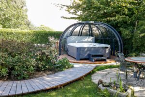 Cette installation ne joue pas seulement le rôle d’abri, elle valorise le bassin et donne l’impression d’une piscine intérieure, répondant au souhait des propriétaires de pouvoir vivre à l’extérieur comme à l’intérieur toute l’année.