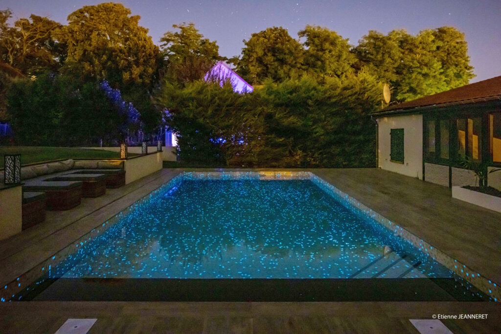 Caractéristiques techniques particulières : Piscine rectangulaire à mosaïque ; système d’éclairage à leds synchronisé entre la piscine et le jardin