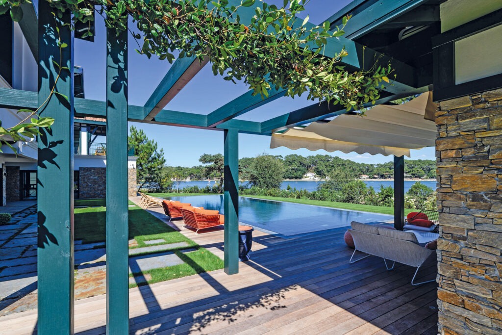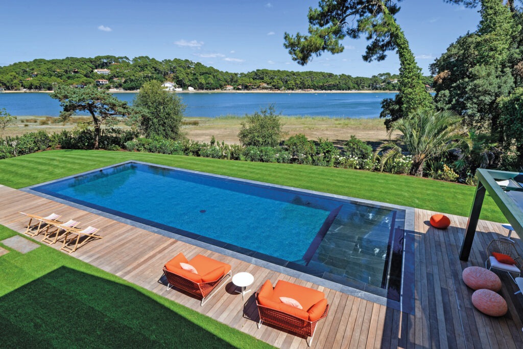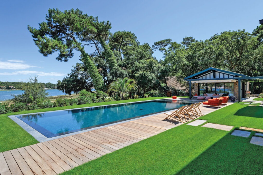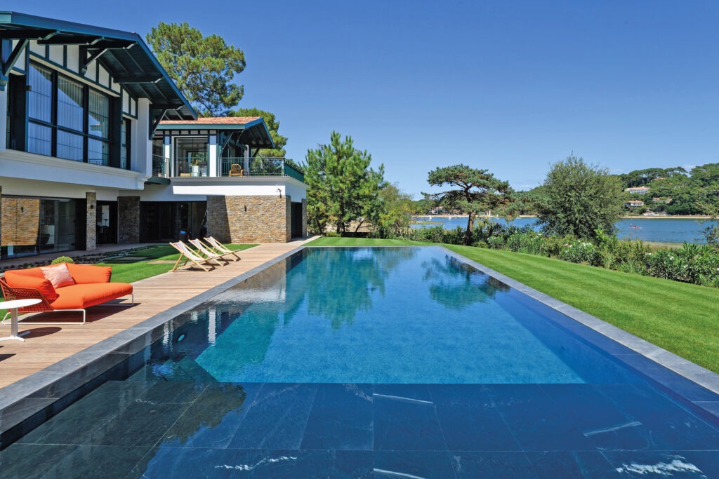 Semblant faire la course avec le lac mitoyen, cette piscine miroir s’étire sur 15 mètres. Son miroir et sa couleur sombre aspirent à voler la vedette à l’un des lacs les plus en vue de la côte basque. Revue de détail sur une piscine au désir d’exception.