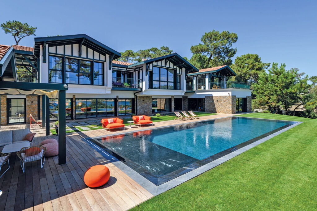 Situées au bord du lac océanique d’Hossegor, l’ancienne maison et sa piscine ont laissé leur place à un nouveau projet plus ambitieux. La maison a été reconstruite dans le style des bâtisses basques labourdines. Elle se distingue par ses pans de bois apparents au premier étage, peints en vert sombre, presque noir au lieu du rouge traditionnel, dans une version voulue contemporaine.