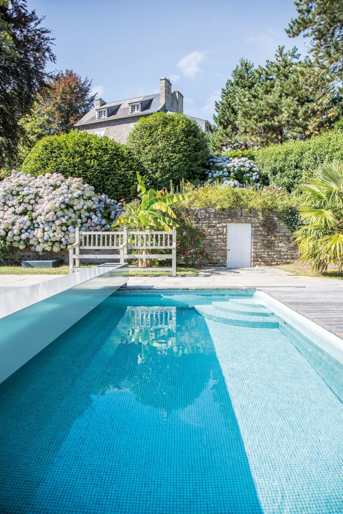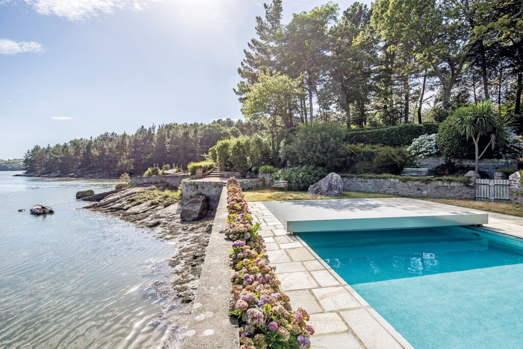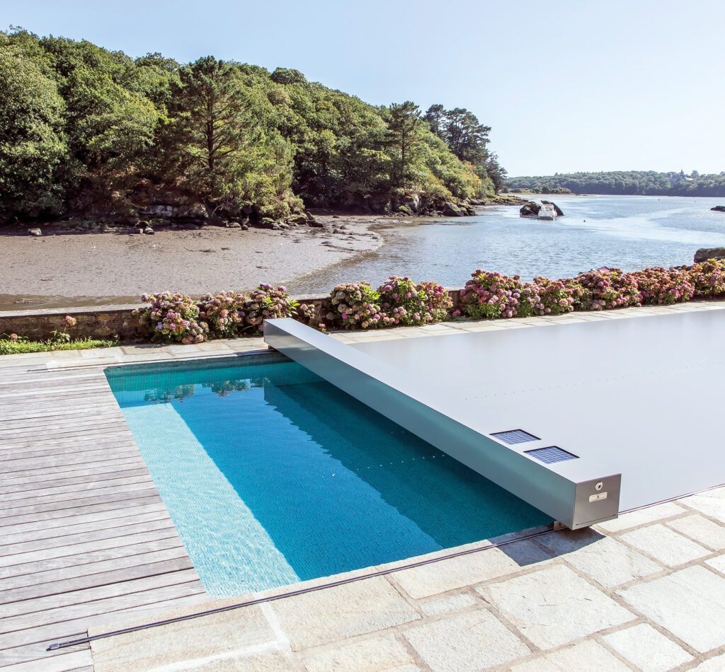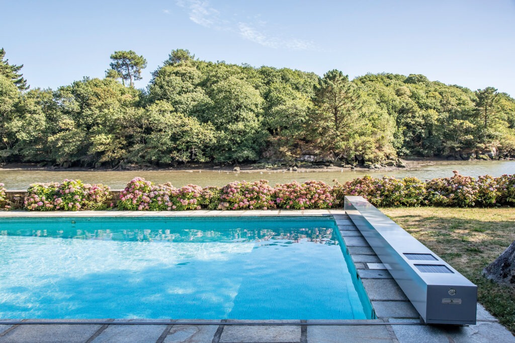 Cette piscine traditionnelle s’offre une couverture des plus modernes sur le marché. Fine et élégante, ultra-technique et automatique, elle couvre et découvre lentement le bassin à l’image du flux et du reflux des marées bretonnes.
