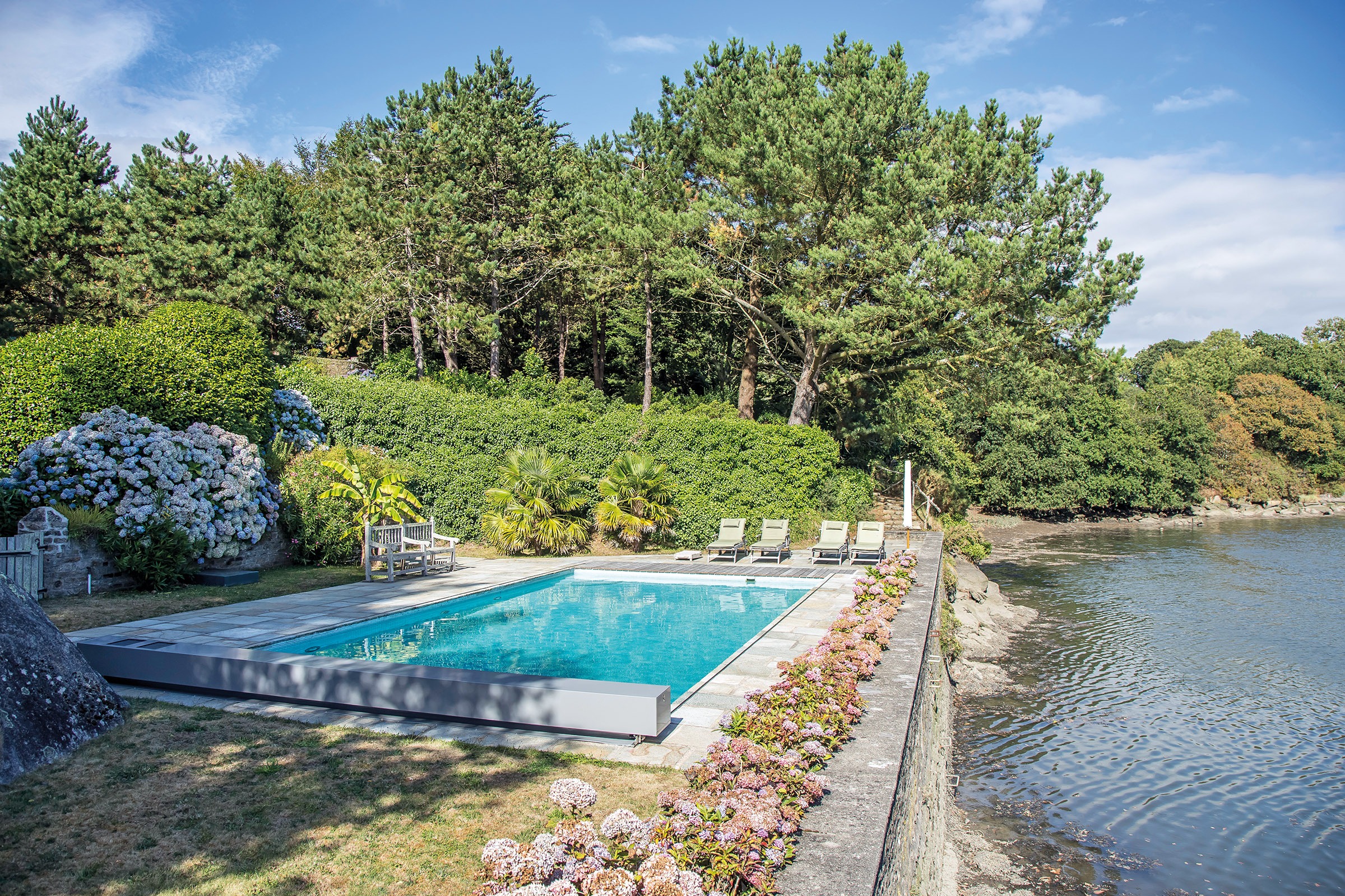 Cette piscine traditionnelle s’offre une couverture des plus modernes sur le marché. Fine et élégante, ultra-technique et automatique, elle couvre et découvre lentement le bassin à l’image du flux et du reflux des marées bretonnes.