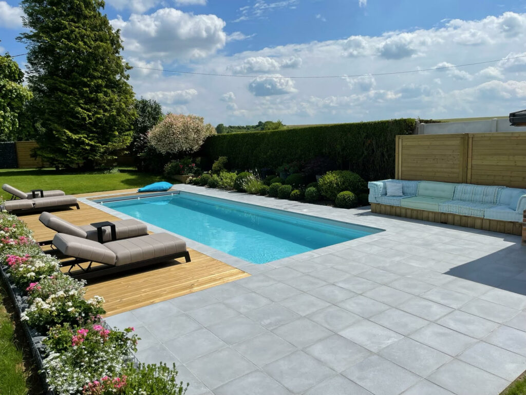 Equipement : escalier d’angle 3 marches droites, volet immergé Out’Deck, pompe à chaleur