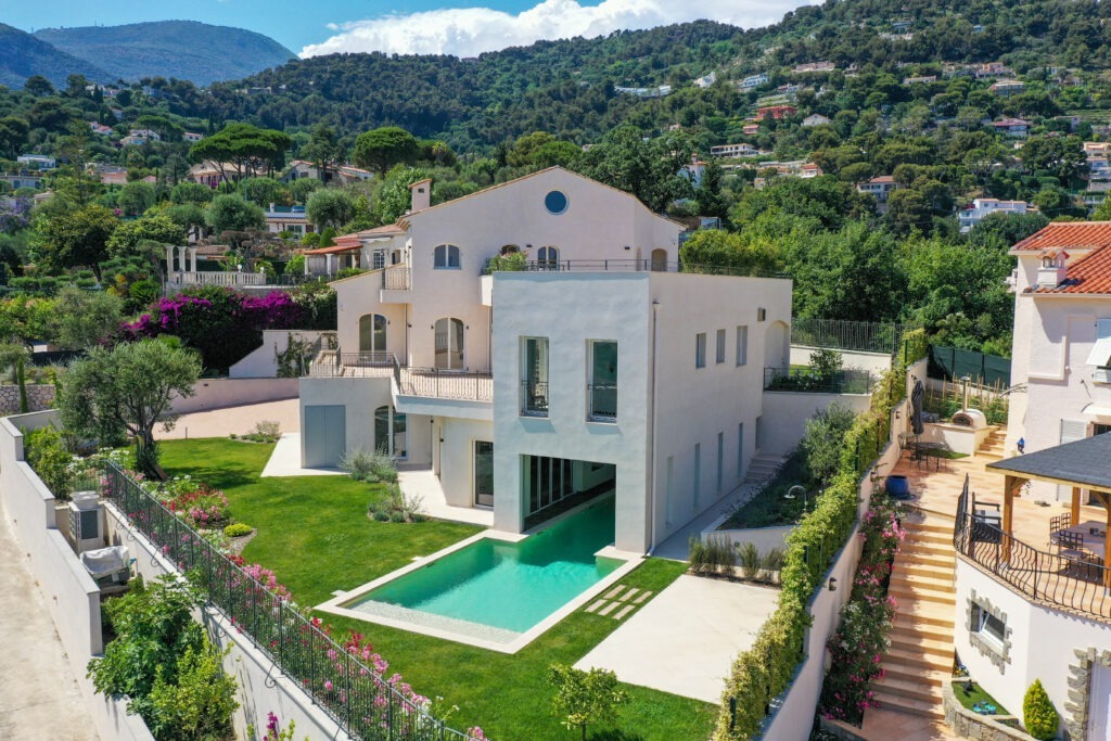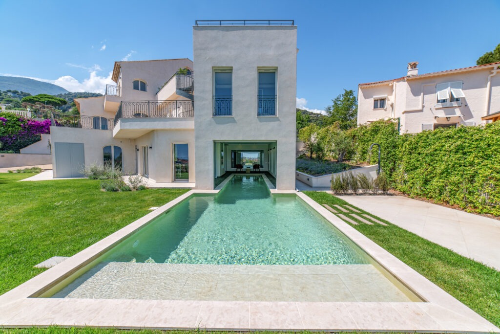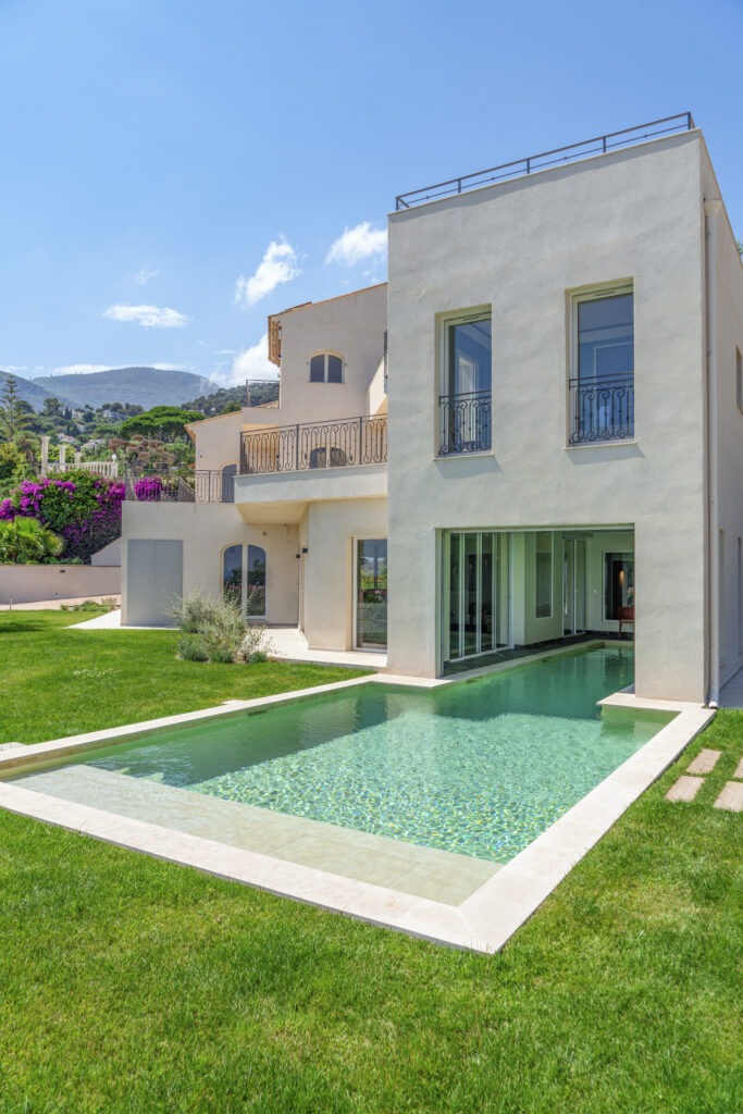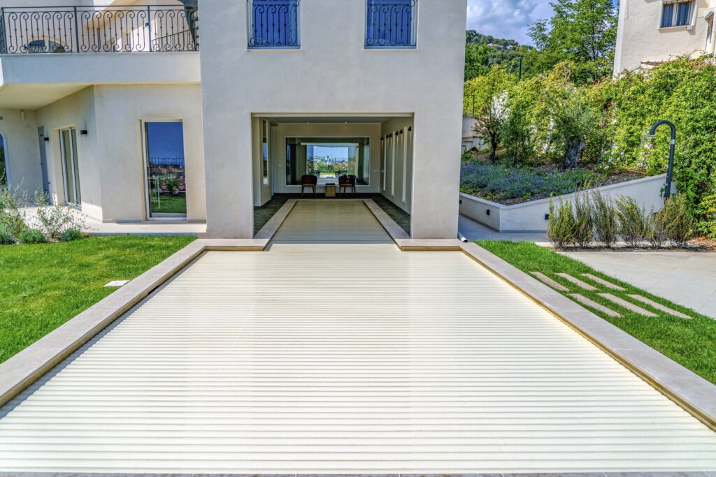 Le bassin ne fait qu’un, mais son usage peut être dissocié, car il est recouvert par des volets roulants immergés indépendants. Cette segmentation des volets laisse l’opportunité d’ouvrir uniquement l’une des parties, notamment celle située à l’intérieur en période plus fraîche. Une astuce qui permet de profiter de la baignade en toute saison, presque toute l’année sous une latitude méditerranéenne propice.