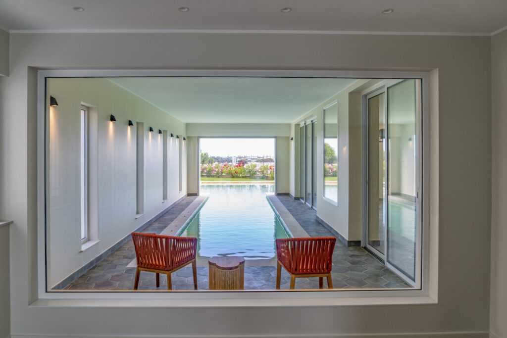 La vaste piscine de près de 17 mètres de long se partage en deux… à souhait. Une partie est construite à l’abri dans l’annexe de la maison spécialement bâtie pour la recevoir, tandis que l’autre partie s’étire au soleil, en extérieur.