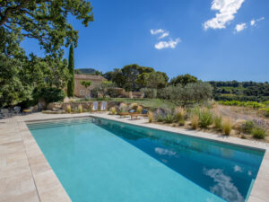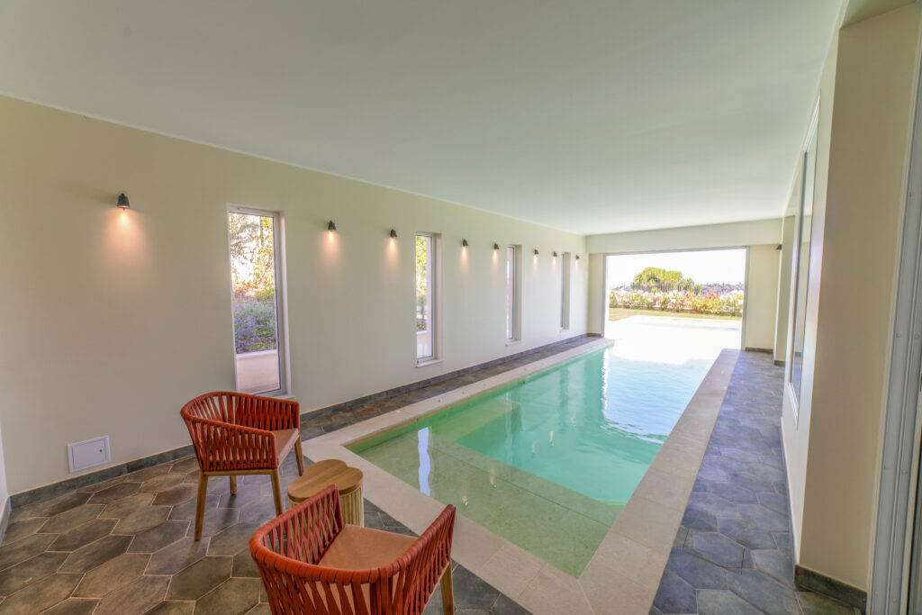 Dans une annexe de la maison principale, une piscine intérieure et extérieure de près de 17 mètres a tracé sa ligne droite. Une moitié en intérieur, abritée, l’autre moitié en extérieur sous le soleil méditerranéen. Une piscine deux en un pour un usage prolongé dans l’année.