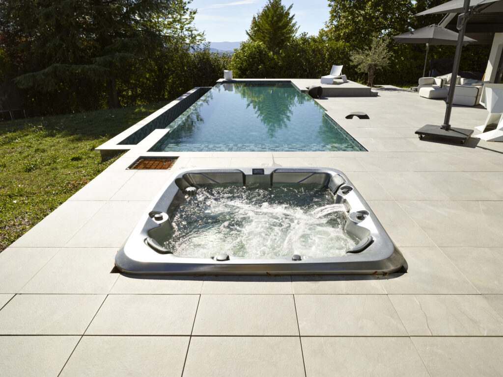 L’accès aux profondeurs du bassin s’effectue par un escalier immergé en angle. À l’autre extrémité, un spa intégré à la terrasse invite au bien-être avec ses hydrojets massants. Ici, l’accès à la piscine se fait par une plage immergée dans la largeur du bassin, à quelques centimètres sous le niveau de l’eau.