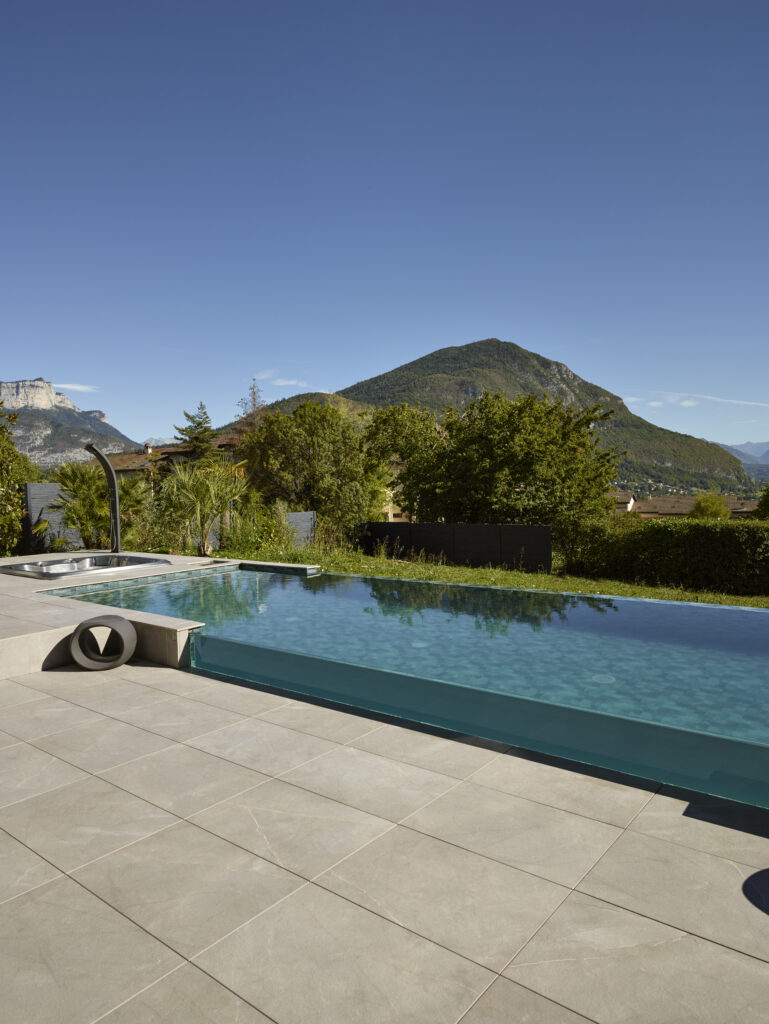 La pureté de l’écriture de ce bassin semble si simple qu’elle en fait oublier la précision de l’ouvrage. Une paroi de verre sur laquelle déborde l’eau est installée dans la partie centrale de la longueur côté habitation et un débordement fuse sur la longueur opposée faisant face à l’immensité du paysage de montagne. Au cœur de ce dernier, le lac d’Annecy s’étire en contrebas et inspire toute la mise en scène de l’ouvrage. Depuis sa situation en hauteur, la piscine est positionnée de façon à longer le lac. Le graphisme de son dessin épuré est accentué par ses dimensions, 13 mètres de long par 3,5 mètres de large, et par le choix d’un revêtement en membrane armée coloris mosaïque vert-de-gris. Plus vrai que nature, cet effet texturé mime les nuances de l’eau du lac.