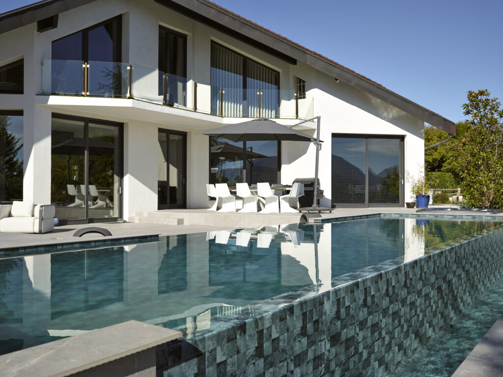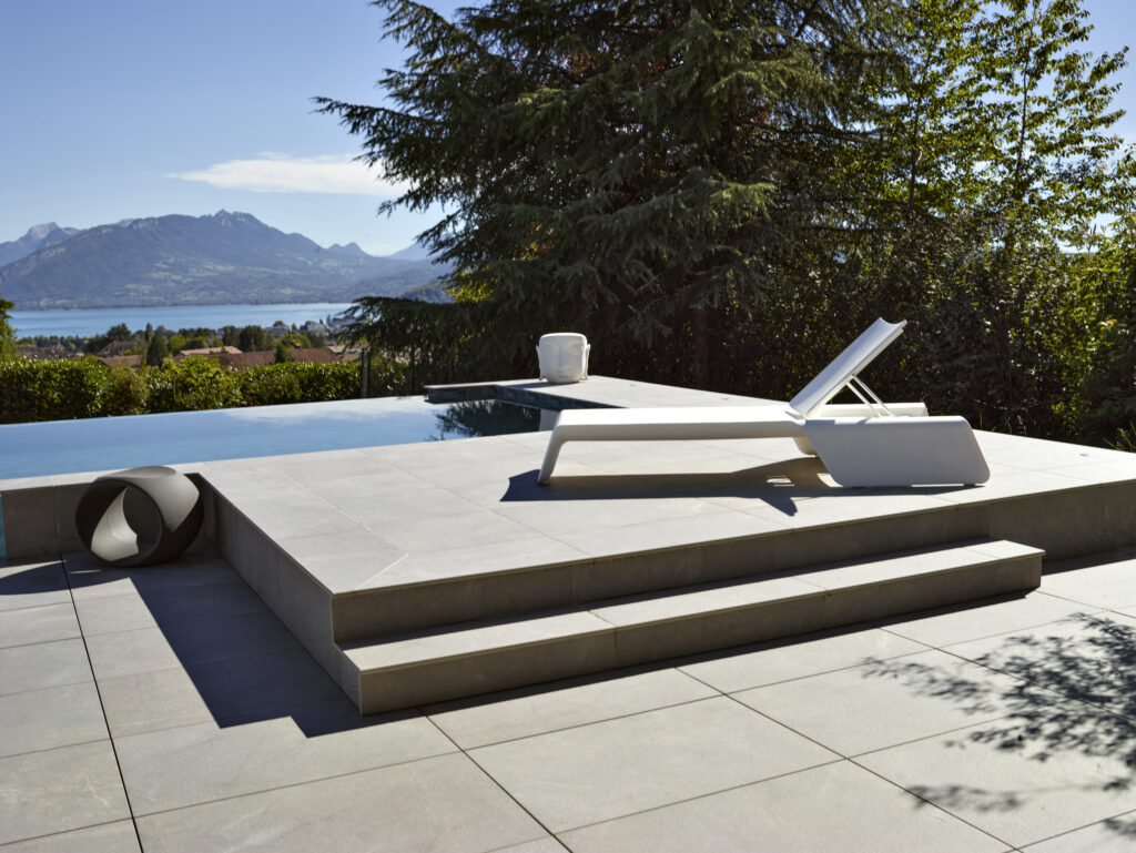 La piscine à débordement emprunte tous ses codes au lac d’Annecy situé en contrebas. De ses effets de lumière aux nuances de sa couleur, le jeu des ressemblances est magnifié par sa paroi de verre qui dresse le bassin en majesté face à l’exceptionnel panorama.