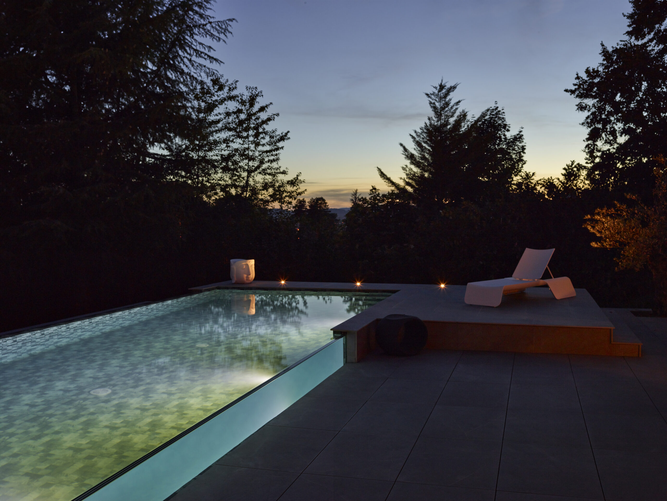 Cette piscine à débordement est sublimé à la nuit tombée, lorsque l’eau s’illumine sous le feu des projecteurs Led immergés. La piscine brille alors comme un joyau dans son écrin montagnard.