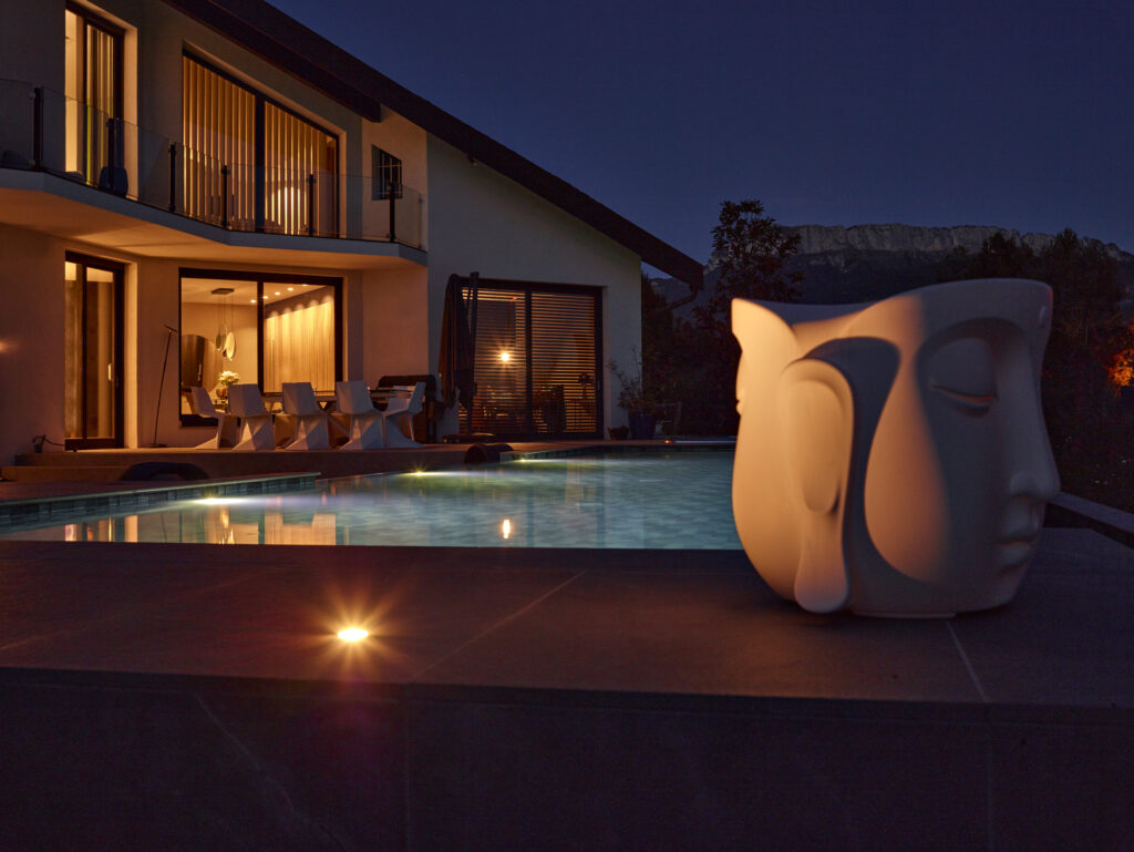 L’ensemble est porté haut par deux terrasses surélevées de part et d’autre du bassin. Elles viennent positionner les occupants au ras de l’eau, proposant chacune une conception singulière de la relaxation. Sur l’une d’elles, le farniente s’apprécie dans un bain de soleil.