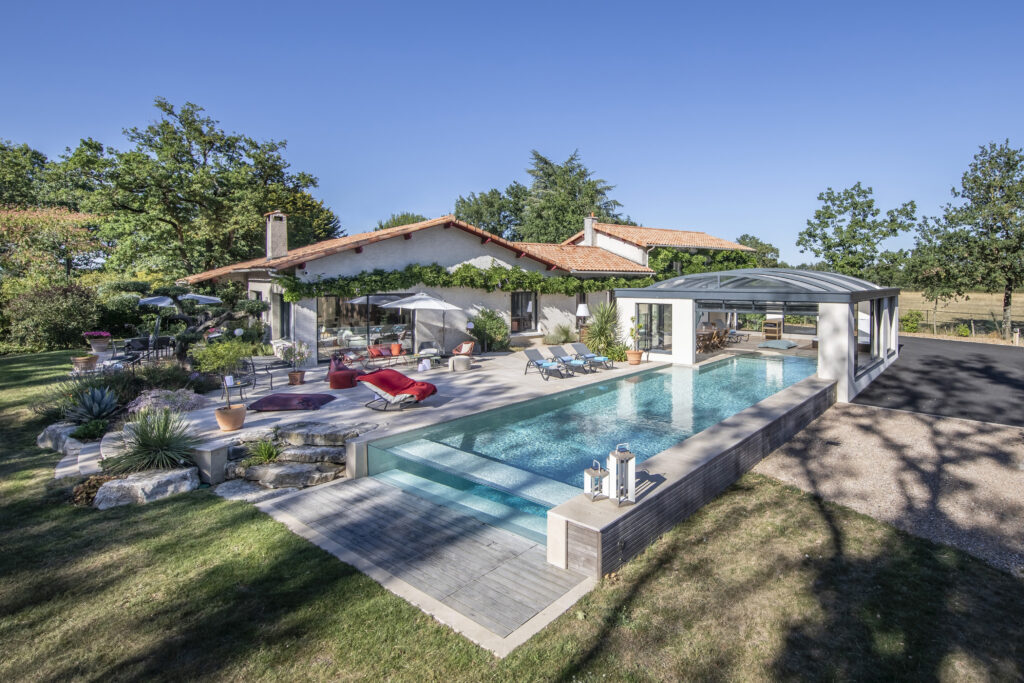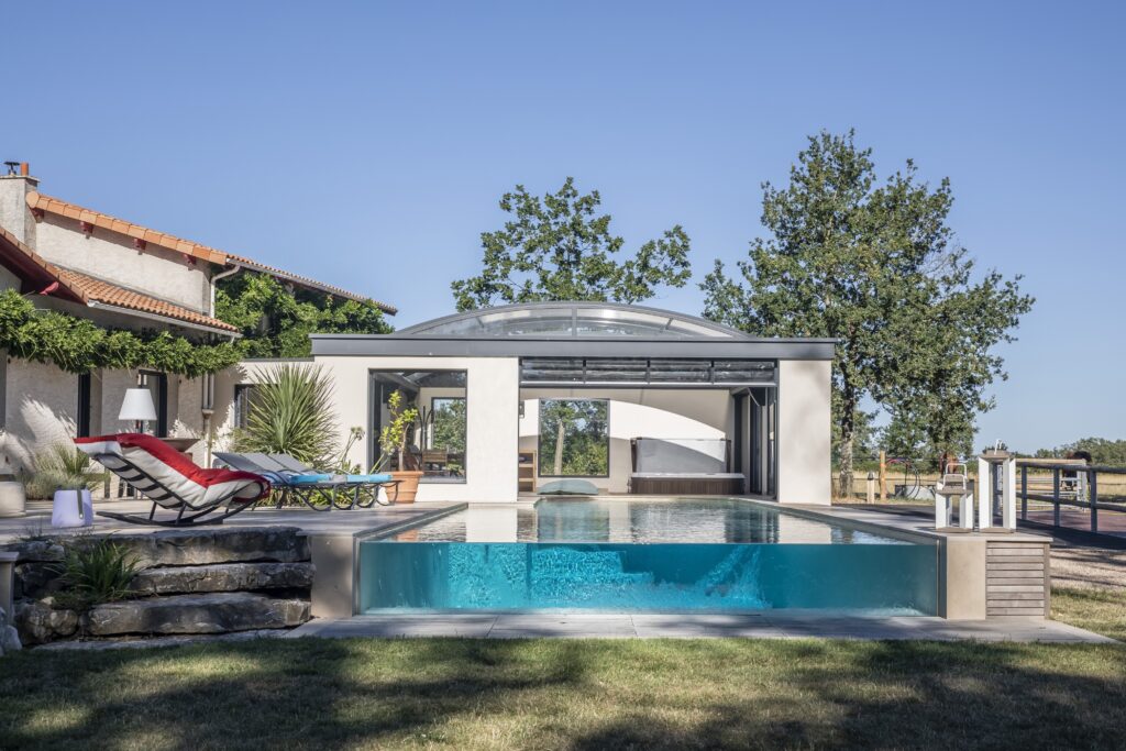 Les deux espaces de bain peuvent être séparés par une cloison en verre et procurer deux zones de baignade distinctes en différentes saisons. Sous l’abri haut, un espace séjour salle à manger vient conforter l’usage de la piscine couverte en pièce de vie, également doté d’un spa pour des baignades en toute saison. Tandis qu’à l’extérieur, une grande terrasse équipée de bains de soleil, de fauteuils et d’un coin salon s’offre aux beaux jours pour profiter au maximum du cadre champêtre avec vue sur les massifs paysagés et sur l’étang tout proche.