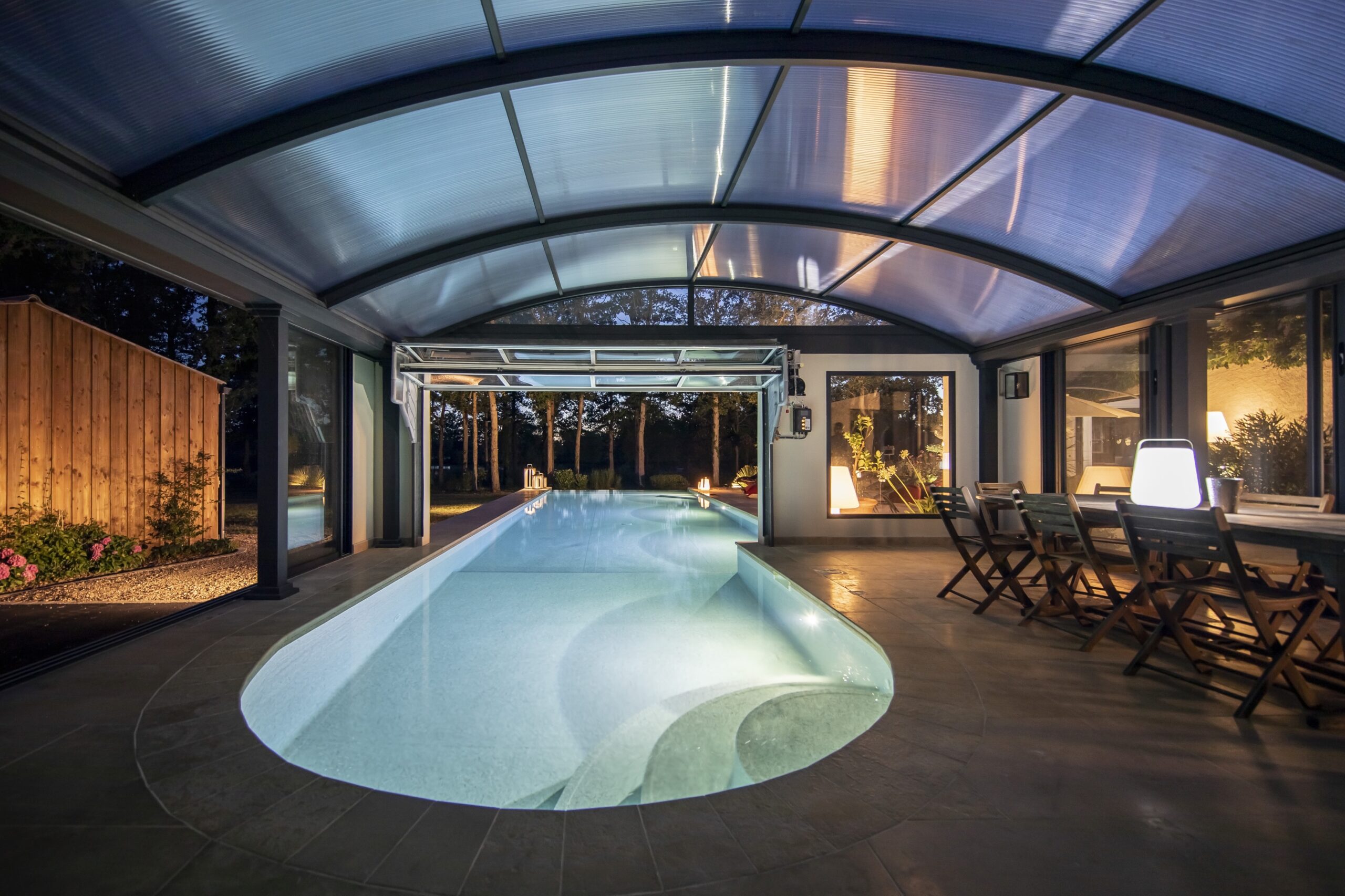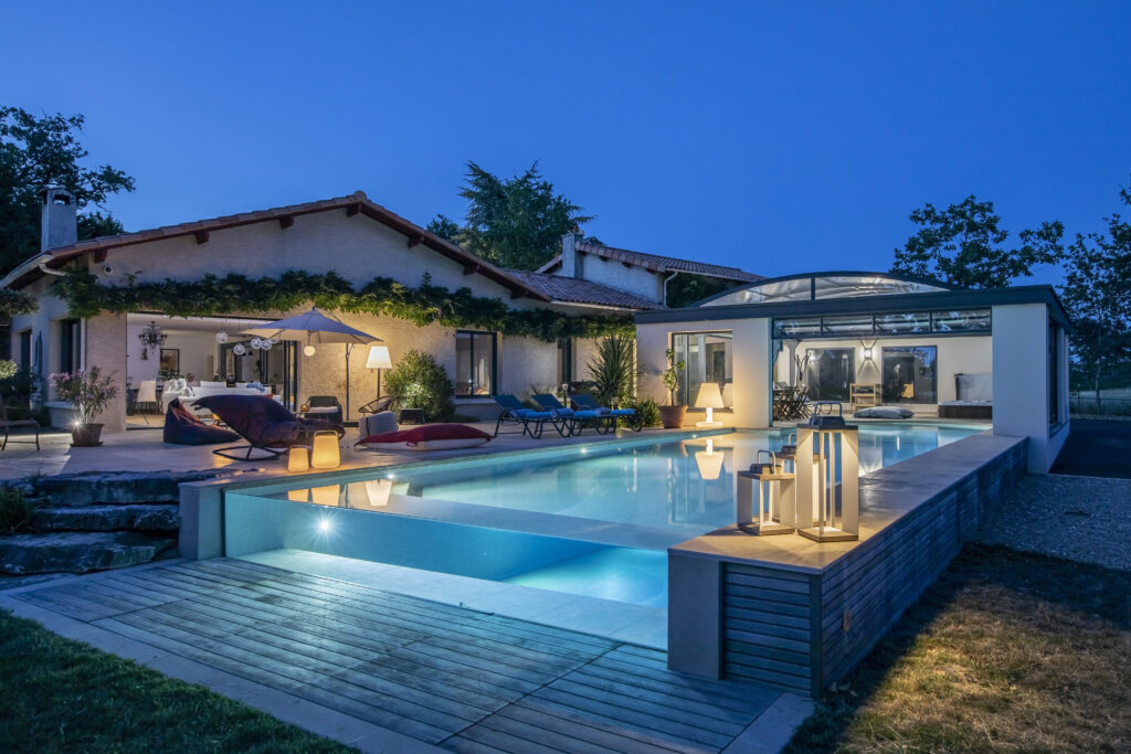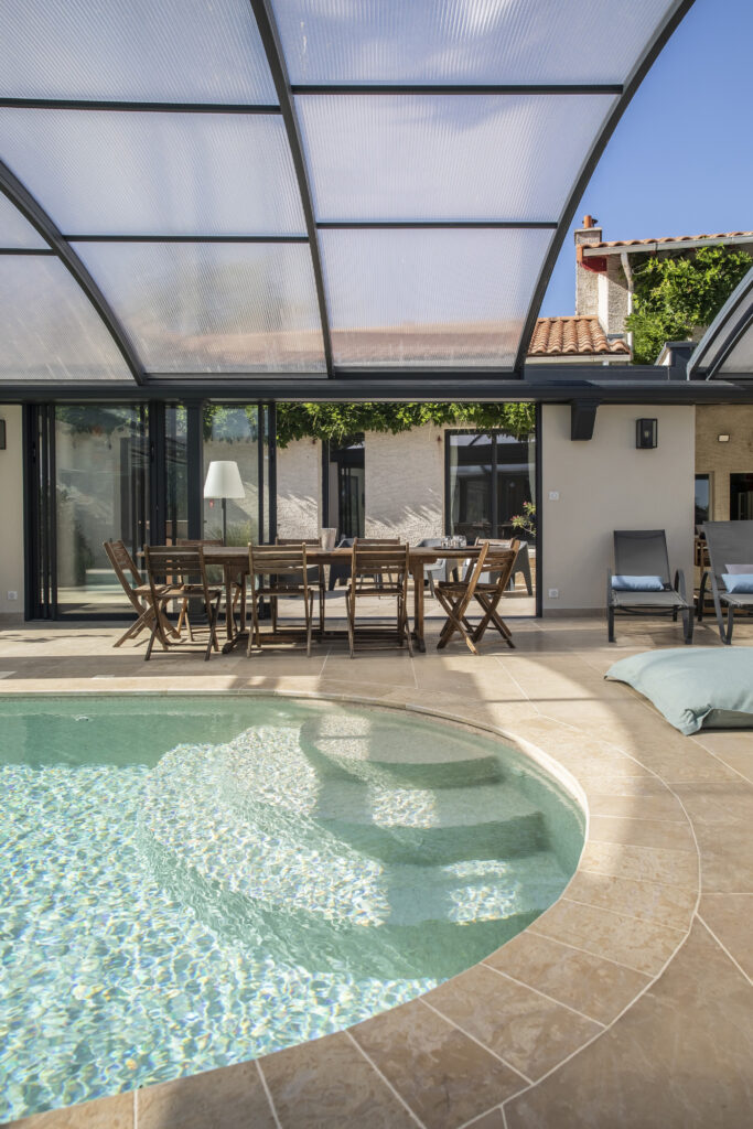 Une piscine particulièrement originale, puisqu’elle peut au gré des envies et des conditions météorologiques être une piscine intérieure ou d’extérieur. Une partie du bassin est abritée par un abri haut en cinq modules amovibles, tandis que l’autre partie du bassin dessinée comme un couloir de nage s’allonge sur le terrain le long de la terrasse et se finit par un débordement sur une paroi de verre. La transparence de cette paroi en bout de bassin apporte une luminosité incomparable jusqu’au fond de l’eau.