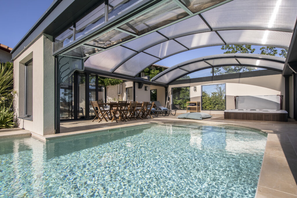Equipements : PAC, escalier roman inversé, volet immergé Rollinside, projecteurs, abri de piscine haut amovible (5 modules) 9,40 m x 7,62 m, hauteur de 2,20 m à 3 m en structure aluminium et vitrage en polycarbonate et verre