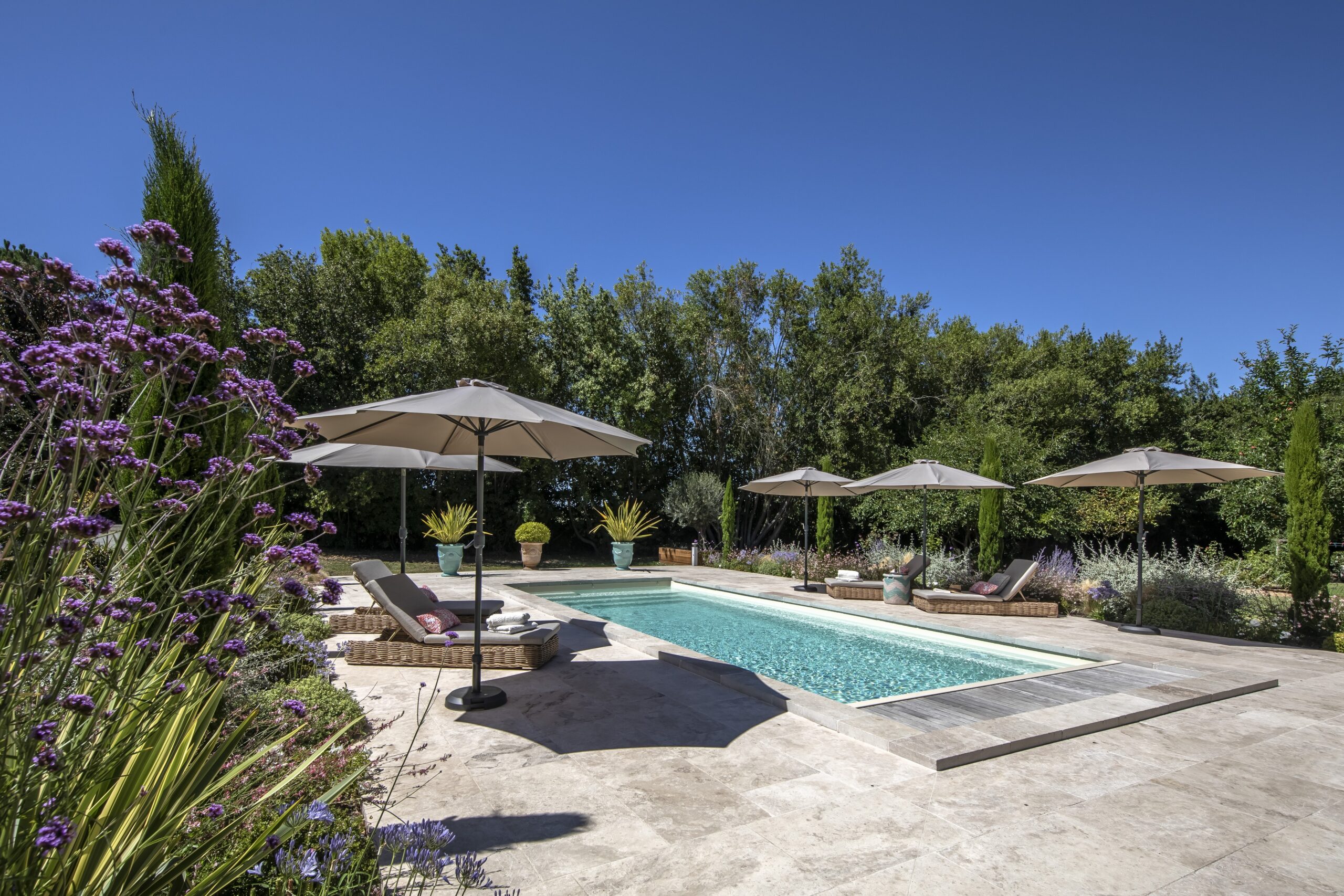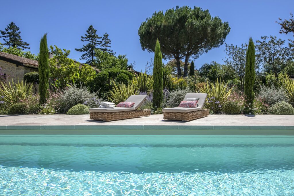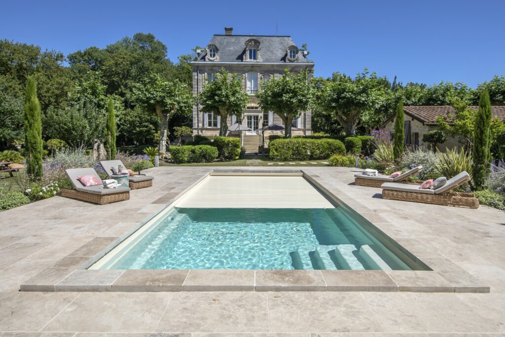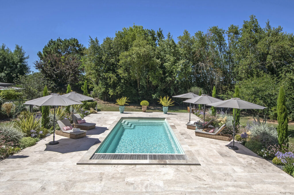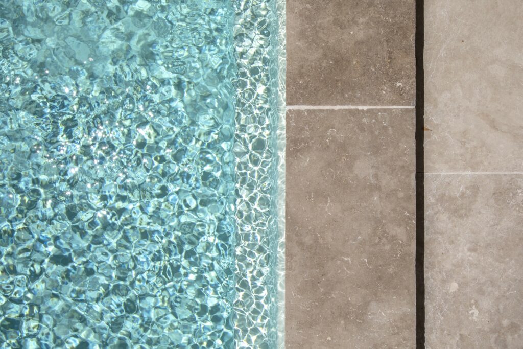 L’esthétique de la piscine est travaillée pour se fondre dans ce superbe décor entre pierre et verdure. Ainsi, la pierre naturelle en travertin est mise à l’honneur dans ce projet : elle entoure parfaitement la piscine, avec des margelles hautes de huit centimètres et prolonge l’espace détente sur l’ensemble de la terrasse. La pierre de travertin épouse à merveille l’âme de la demeure.