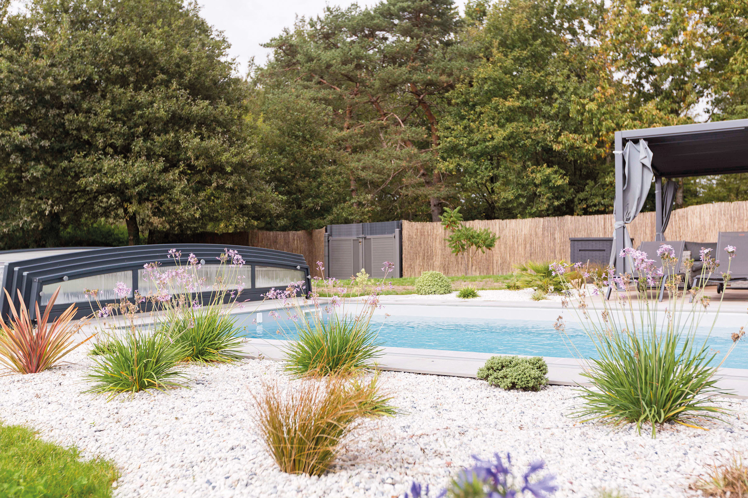 Pour cette réalisation, le propriétaire a opté pour une piscine discrète et résolument conviviale. Un grand bassin de 8 mètres sur 4 mètres avec deux zones de baignade distinctes, un petit bain et un grand bain, grâce à deux fonds plats de profondeurs différentes. L’un à 1,20 mètre est pour les enfants, le second à 1,50 mètre est réservé aux adultes. Les deux espaces, reliés par une pente douce, offrent des moments de convivialité entre amis ou en famille. Son escalier positionné en angle permet de descendre dans l’eau sans empiéter sur la longueur du bassin qui reste entièrement disponible à la natation. Les trois marches peuvent aussi servir d’assise pour savourer une belle journée ensoleillée dans la fraîcheur de l’eau. Cette piscine s’harmonise parfaitement à l’esprit contemporain recherché dans l’espace extérieur. Ici, elle est revêtue d’un liner blanc dans le but d’obtenir une couleur d’eau bleu clair, cristalline. Le liner blanc procure à la piscine un aspect lumineux et lui permet d’affirmer un style moderne, pur qui s’accorde avec la maison rénovée et le jardin repensé. Un choix important, puisque, de la couleur d’eau se dégage l’harmonie générale de l’espace extérieur. Ce choix est souligné par des parterres en cailloux blancs aux abords, et de pierres claires en margelle.