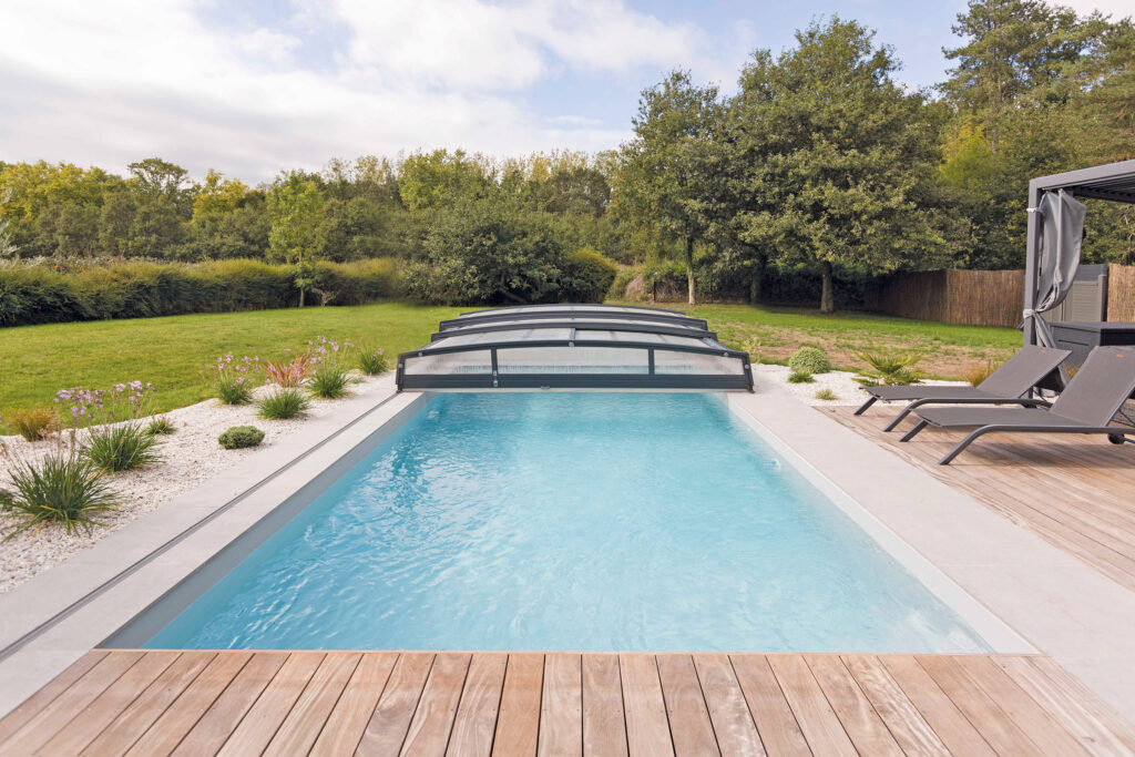 Chauffé par une pompe à chaleur, le bassin l’est aussi par son abri bas de cinquante centimètres de hauteur latérale. Cet abri offre la possibilité de nager dessous, même fermé. Pour ouvrir la piscine, les quatre modules coulissent guidés par un seul rail positionné sur une longueur et disparaissent à son extrémité, en se rangeant l’un sous l’autre, laissant place à la quiétude du lieu.