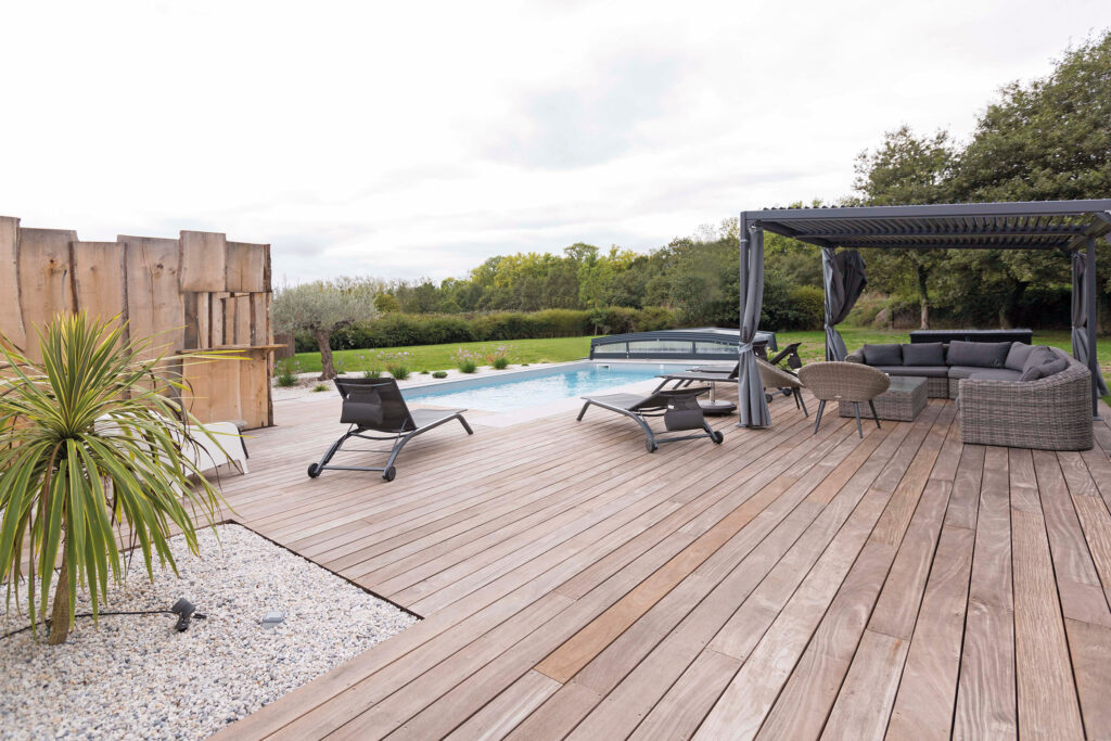 Enfin le bois naturel, présent en terrasse, fait le lien avec les essences présentes au jardin.