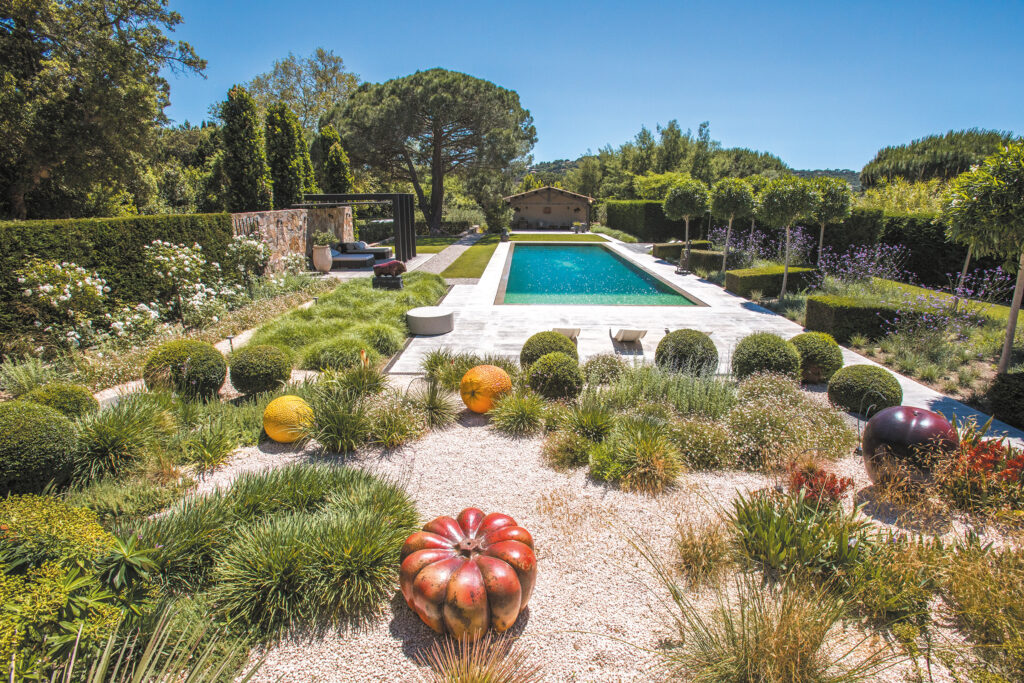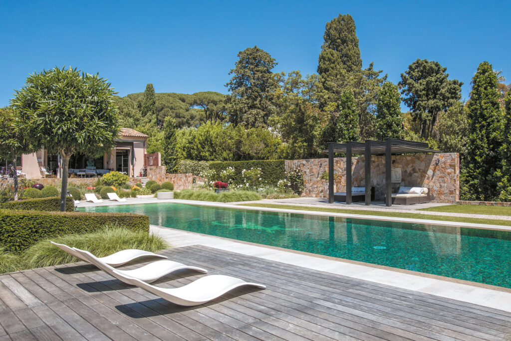 Cette contrainte s’est muée en un puissant élément d’identité. Ligne d’équilibre du jardin, la longueur du bassin est contrebalancée par différents éléments qui viennent rythmer cette linéarité. Massifs, lames de terrasse, piliers de la pergola ou bains de soleil : tous se répondent harmonieusement pour créer un ensemble géométrique équilibré. Dans cette même recherche d’équilibre, plusieurs végétaux sont taillés en ronds parfaits, qui contrastent fortement avec les formes anguleuses de la piscine et des différents espaces au sol. Ces contrastes et ces rythmes qui ponctuent le paysage balayé du regard rompent l’unité de l’ensemble, pourtant taillé dans des proportions hors normes !