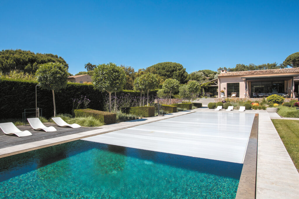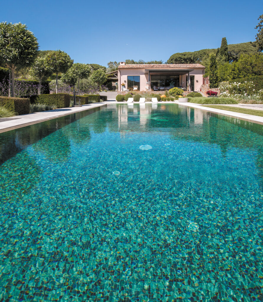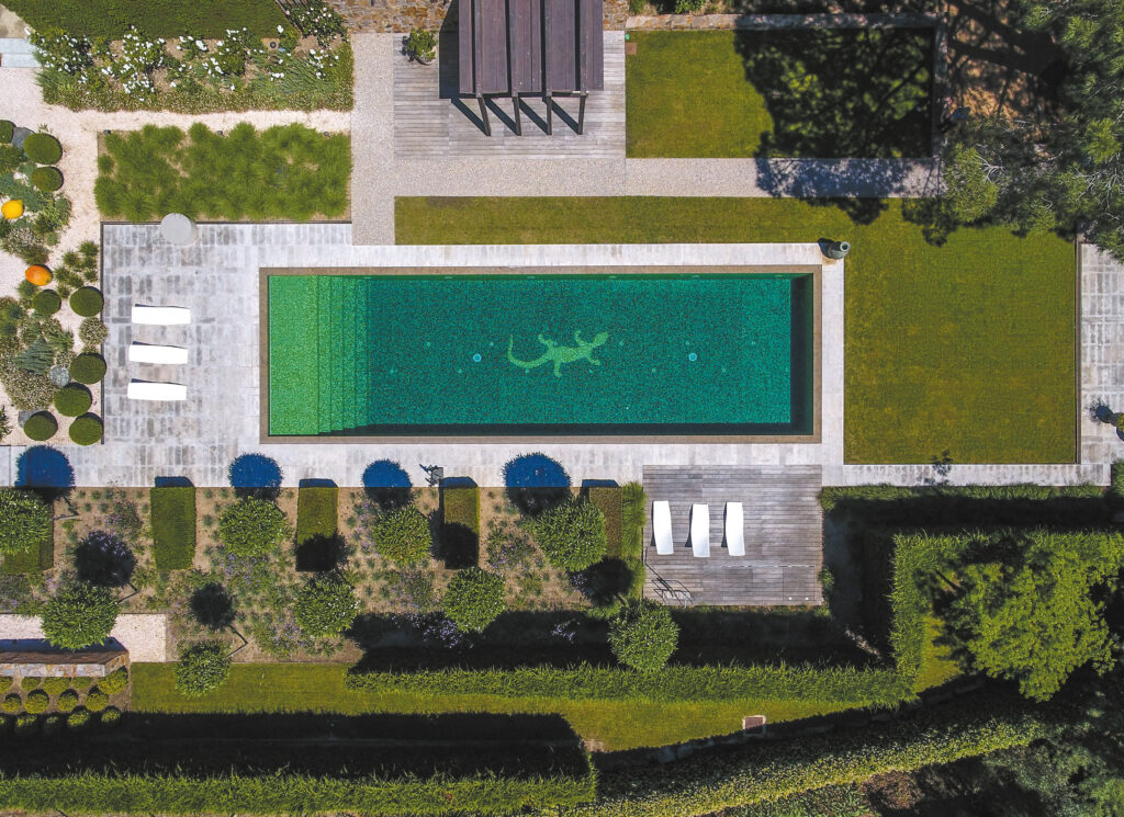 Le couloir de nage s’étend de tout son long dans ce jardin rigoureusement dessiné. Point d’orgue d’une réalisation où chaque élément est à son exacte place, la piscine est au cœur de la propriété autant qu’elle la symbolise. Accord parfait entre art et géométrie, entre rigueur et note de folie, ce bassin illustre parfaitement comment la technique peut se mettre au service de l’esthétique.