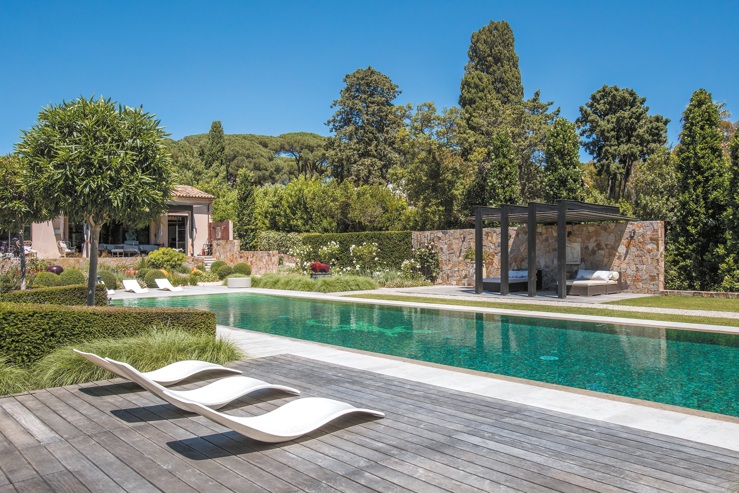 Le couloir de nage s’étend de tout son long dans ce jardin rigoureusement dessiné. Point d’orgue d’une réalisation où chaque élément est à son exacte place, la piscine est au cœur de la propriété autant qu’elle la symbolise. Accord parfait entre art et géométrie, entre rigueur et note de folie, ce bassin illustre parfaitement comment la technique peut se mettre au service de l’esthétique.