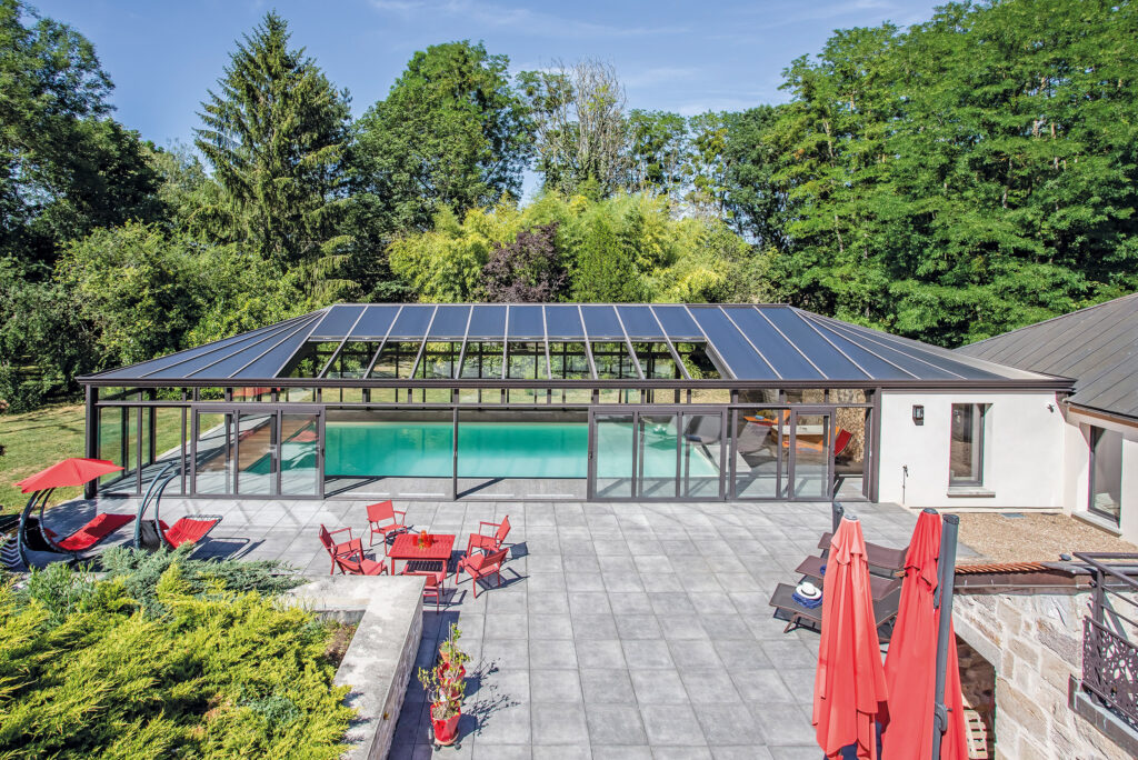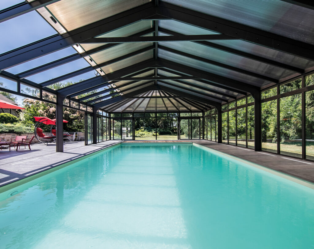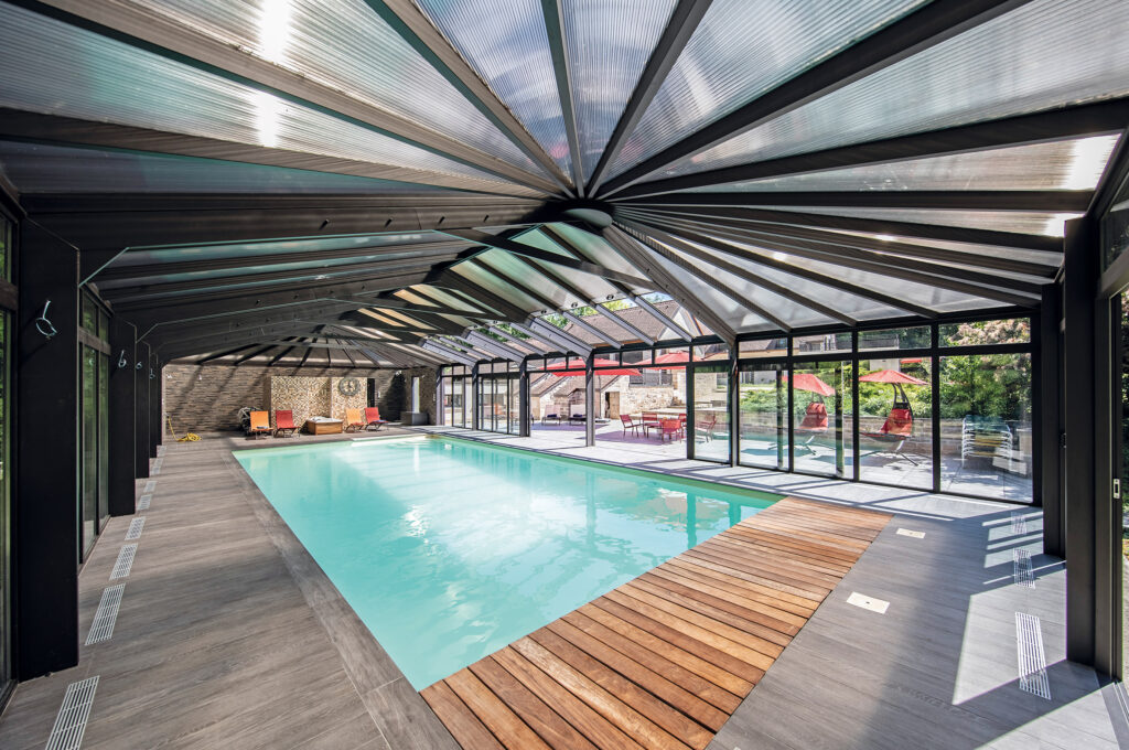 Fermées l’hiver, les baies vitrées s’ouvrent largement aux beaux jours et font disparaître le cloisonnement entre l’espace de la terrasse et ceux de la piscine ou du jardin. Conçu sur mesure pour couvrir la totalité du bassin et ses plages, cet abri est travaillé en deux toitures, classique à pans droits et en corolle à ses deux extrémités, lui apportant une touche sophistiquée. La couverture de toit en polycarbonate alvéolaire teinté bronze assure une protection efficace contre les rayons UV tout en lui conférant un cachet ancien. Sur une partie seulement, les fenêtres de toit s’ouvrent pour donner vue sur le ciel et aérer l’espace au maximum.