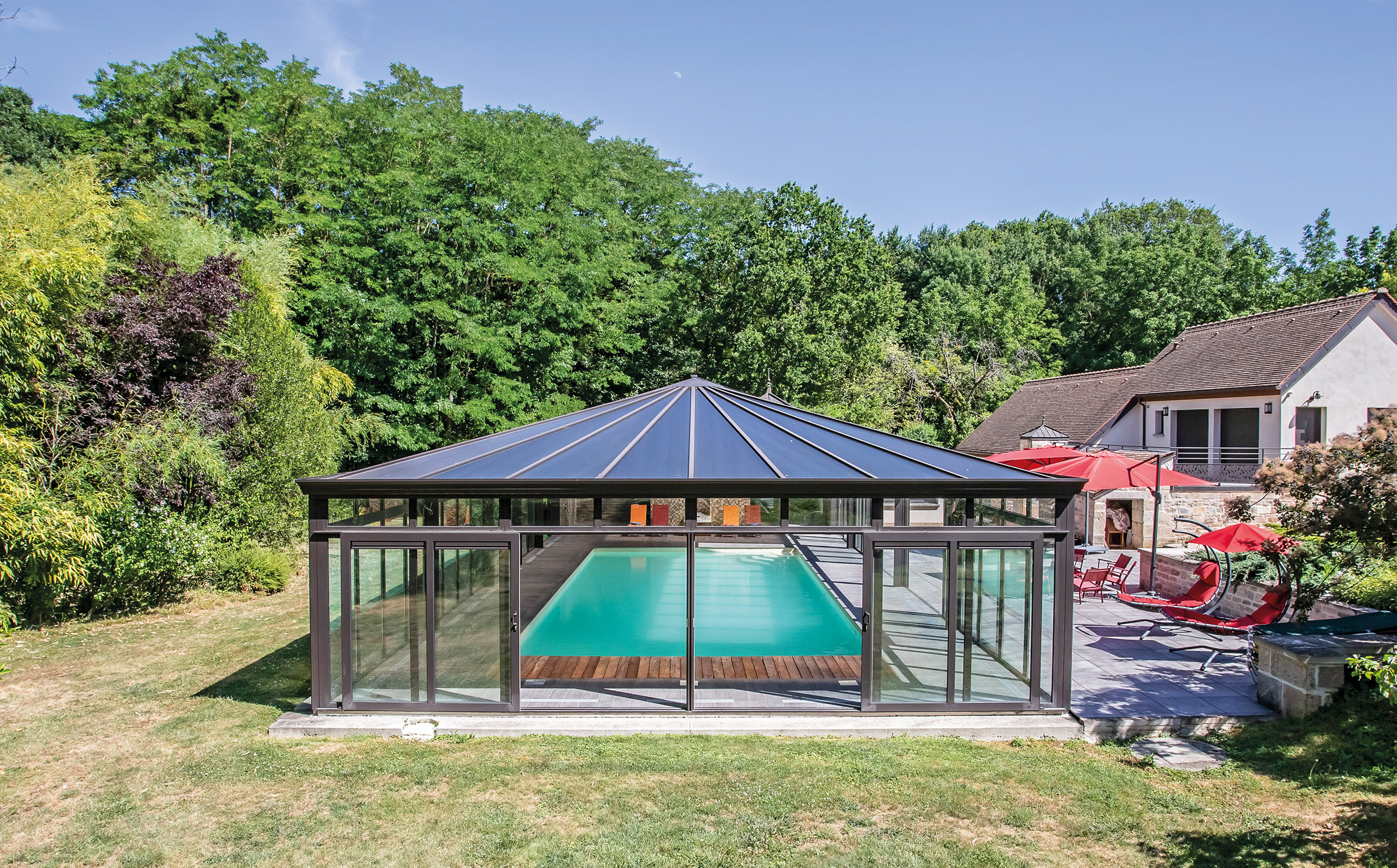 Fermées l’hiver, les baies vitrées s’ouvrent largement aux beaux jours et font disparaître le cloisonnement entre l’espace de la terrasse et ceux de la piscine ou du jardin. Conçu sur mesure pour couvrir la totalité du bassin et ses plages, cet abri est travaillé en deux toitures, classique à pans droits et en corolle à ses deux extrémités, lui apportant une touche sophistiquée. La couverture de toit en polycarbonate alvéolaire teinté bronze assure une protection efficace contre les rayons UV tout en lui conférant un cachet ancien. Sur une partie seulement, les fenêtres de toit s’ouvrent pour donner vue sur le ciel et aérer l’espace au maximum.