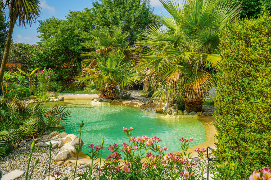 Le jardin se métamorphose en un éden tropical sous le foisonnement de la végétation de palmiers et de bananiers. Une oasis luxuriante qui évoque les lointains rivages des tropiques sans quitter son domicile. Au cœur de ce jardin oasis, la piscine de forme libre plonge ses occupants sur le bord de mer. Le revêtement spécifique de ce bassin en enduit minéral texturé couleur sable, évoque volontairement les plages dorées, et ses margelles inclinées, semblables aux rivages ondoyants, ajoutent une touche d’authenticité à cette piscine. Autour d’elle, la végétation ondule ajoutant sa touche de mystère à ce petit paradis.
