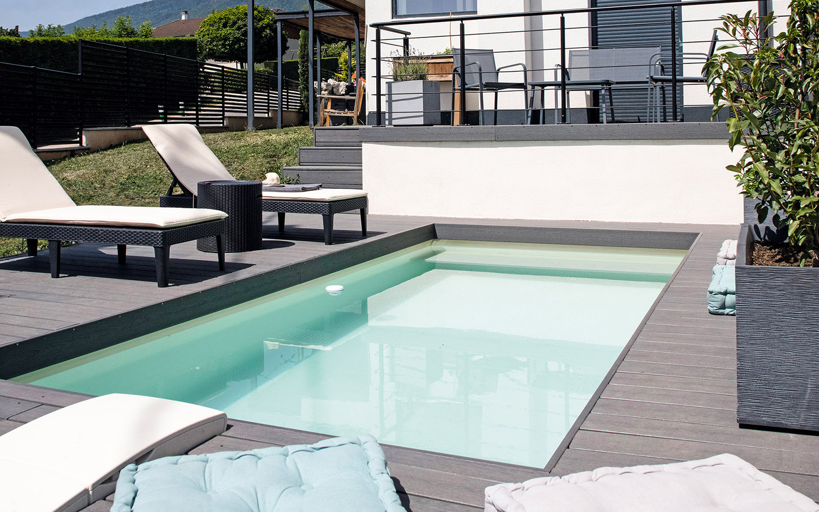 Avec sa forme moderne et sa marche du2019escalier u00e0 deux fonctions : pour descendre dans le bassin ou pour les loisirs, la piscine Nina ru00e9ussit u00e0 optimiser lu2019espace de nage.